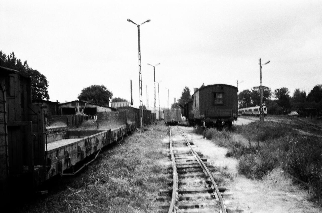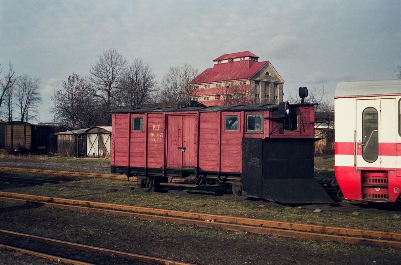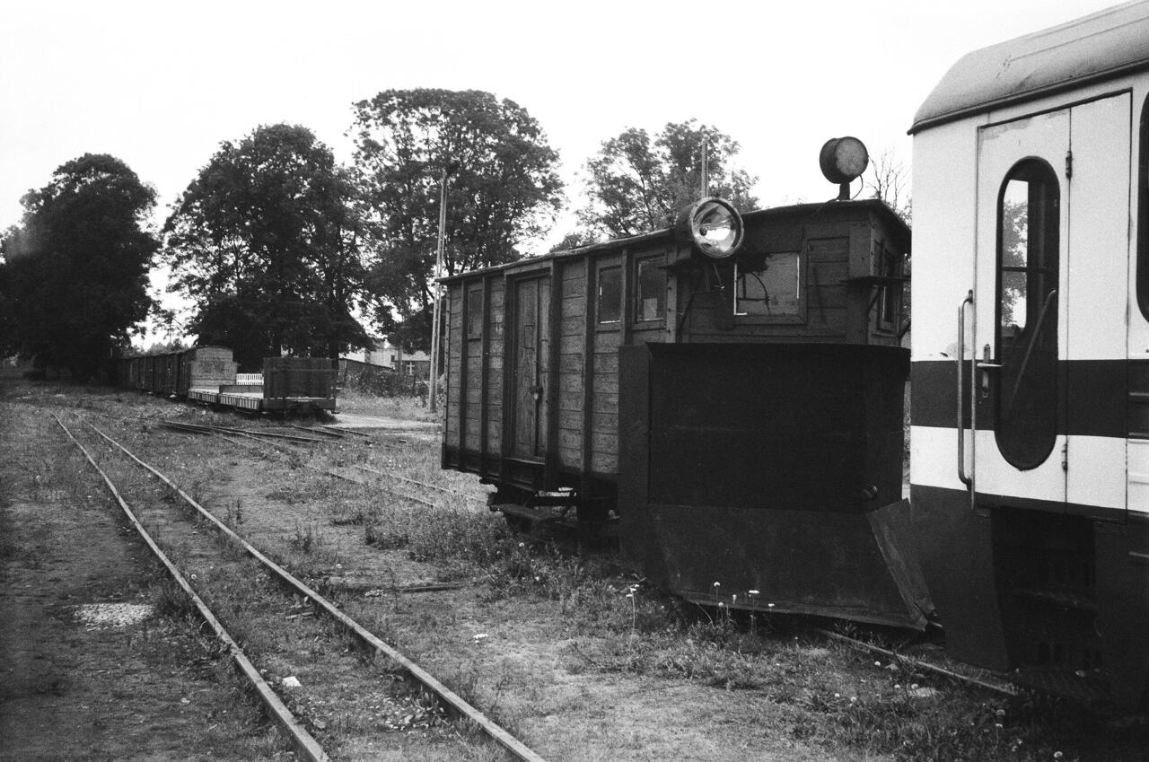 Stacja Ełk Wąskotorowy - tory postojowe, wąskotorowy pług odśnieżny S nr 00 00 922 3007-7 produkcji Ełckiej Kolei Wąskotorowej, przebudowany w 1952 roku z dwuosiowego pruskiego wagonu krytego z 1908 roku. Widok w kierunku końca linii.