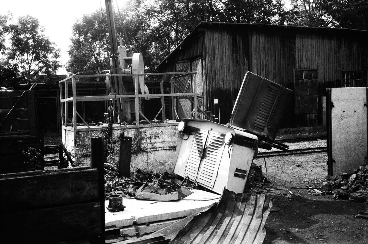 Stacja Ełk Wąskotorowy - lokomotywownia, kanał rewizyjny, żuraw do nawęglania parowozów - widok w kierunku końca linii.