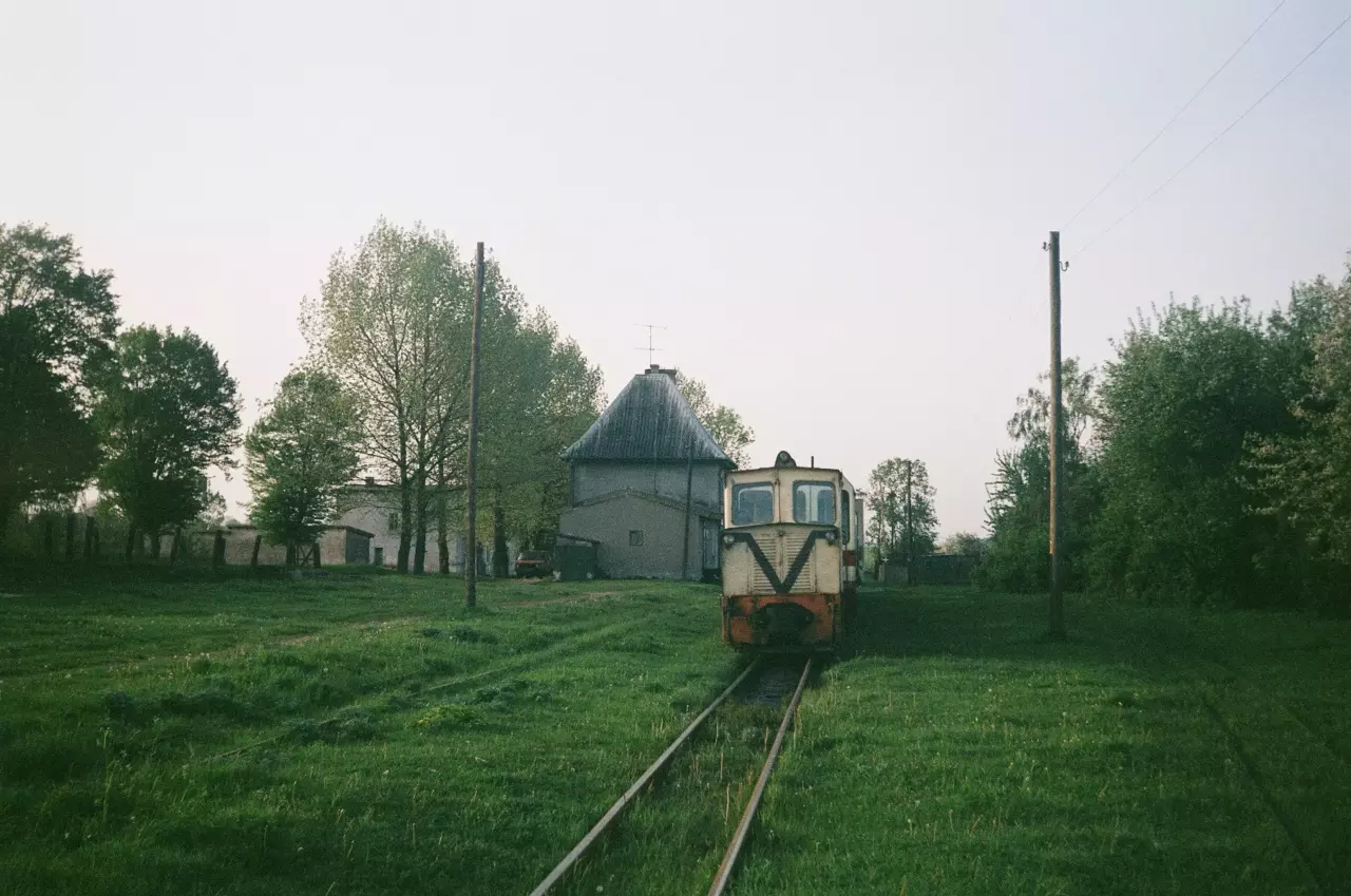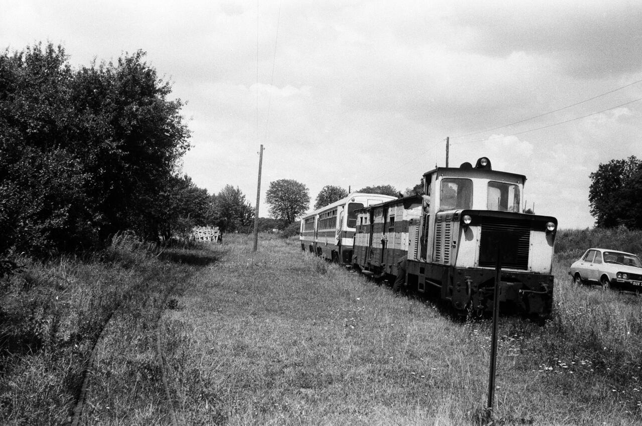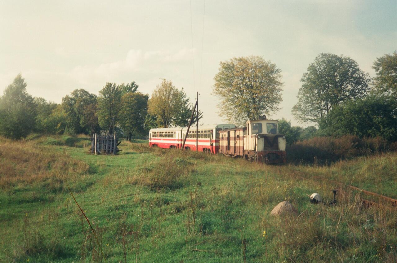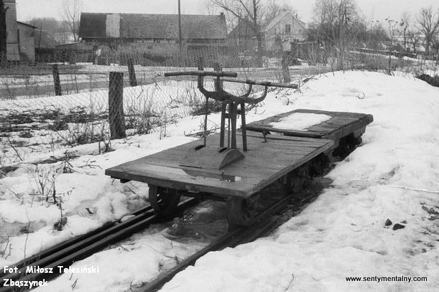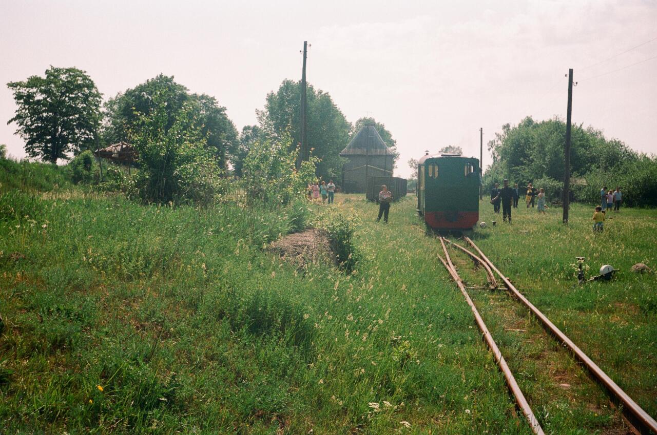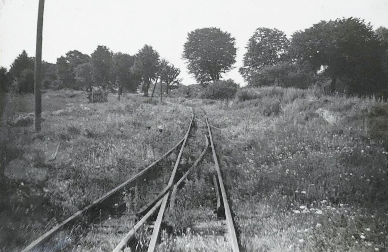 Przystanek osobowy, ładownia Zawady Tworki - lokomotywa Lyd1 w trakcie oblotu składu, widoczny słupek hektometrowy - km 9,9 linii Laski Małe - Zawady Tworki. Widoczne zaangażowanie miejscowych dzieci w układanie drogi przebiegu. Widok w kierunku końca linii.