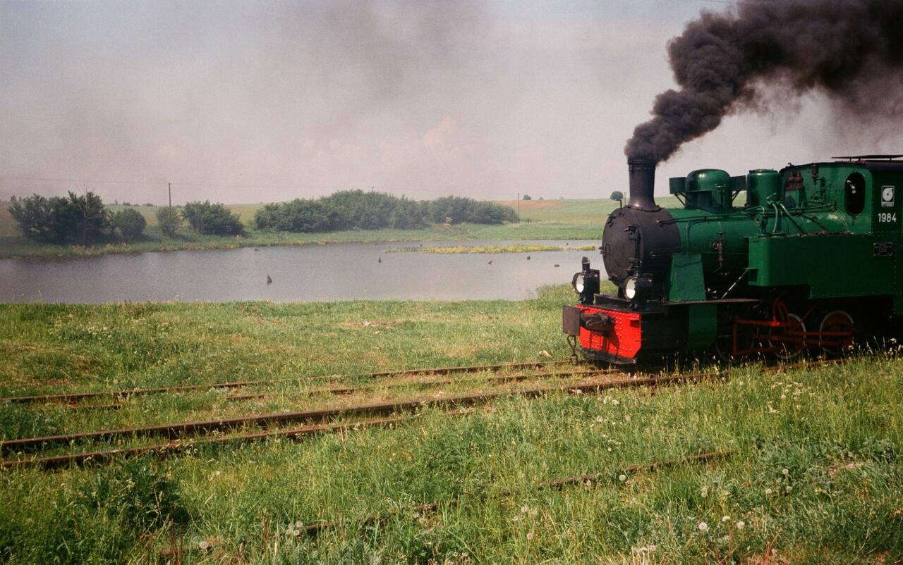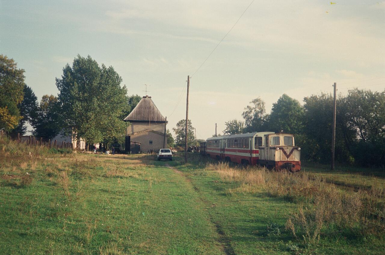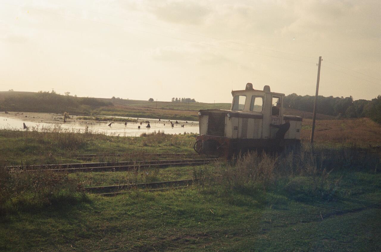 Przystanek osobowy, ładownia Zawady Tworki - Lyd1-220 podczas oblotu składu, na dalszym planie staw - obecnie nieistniejący.