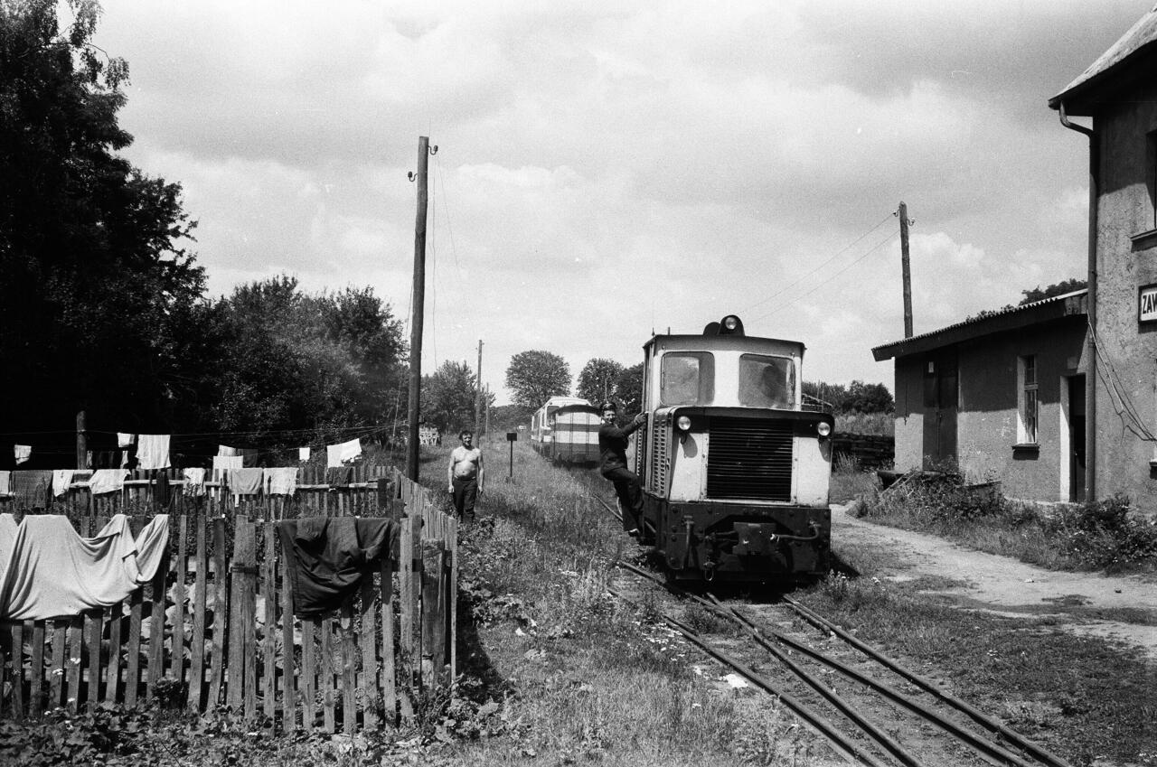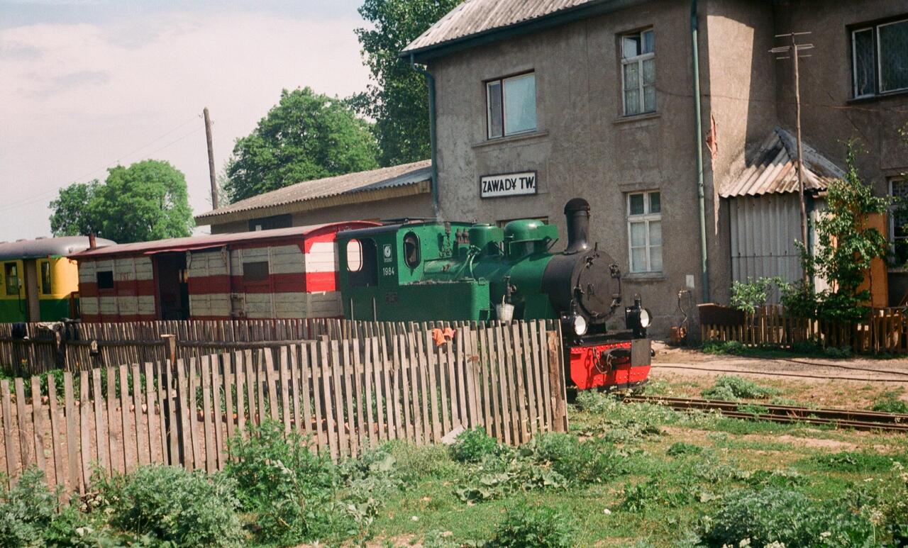 Przystanek osobowy, ładownia Zawady Tworki - wyjazd pociągu OS 18152 relacji Zawady Tworki - Ełk Wąskotorowy, prowadzonego lokomotywą Lyd1-214, na dalszym planie staw - obecnie nieistniejący. W prawo - kierunek Laski Małe.