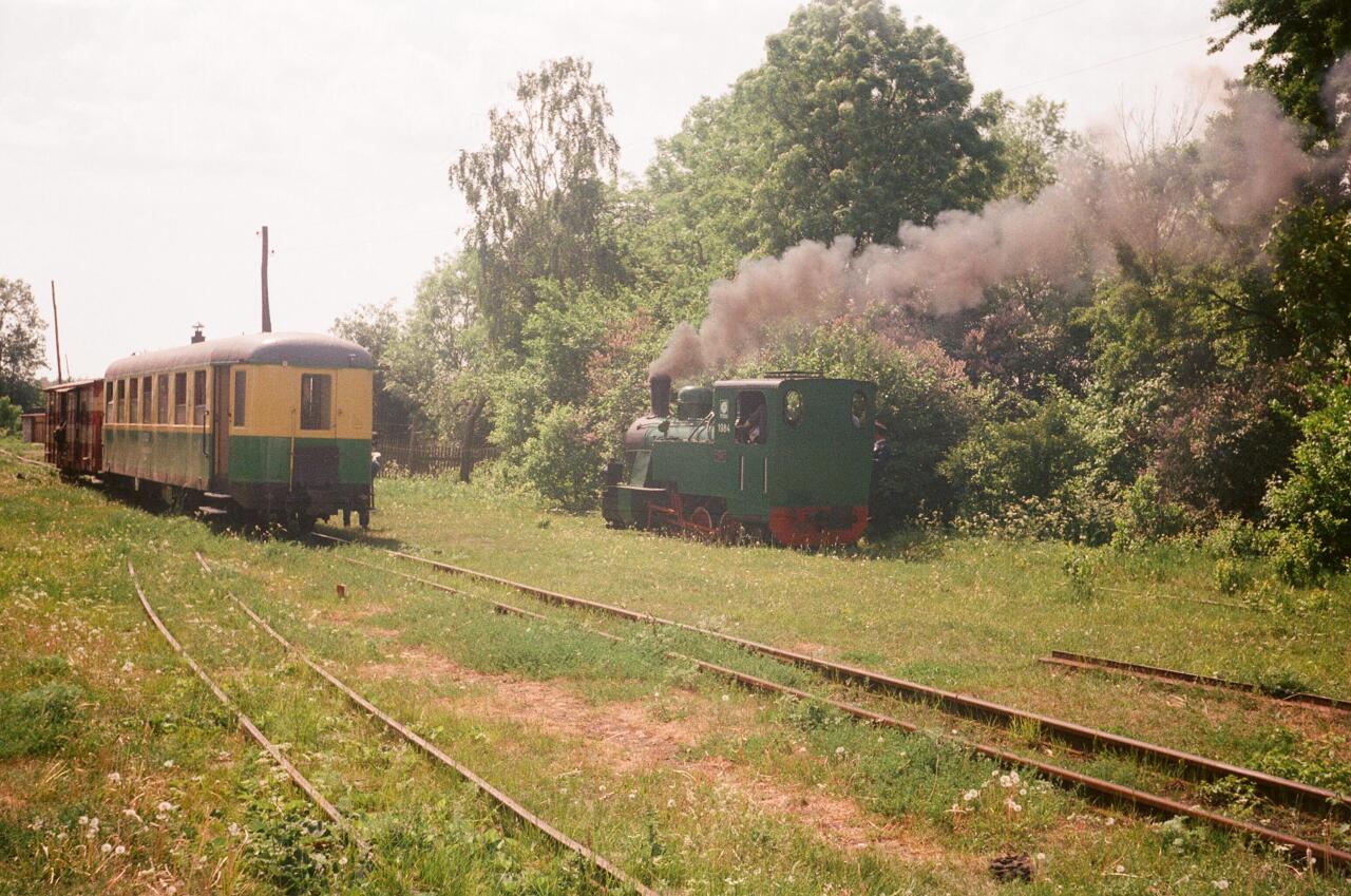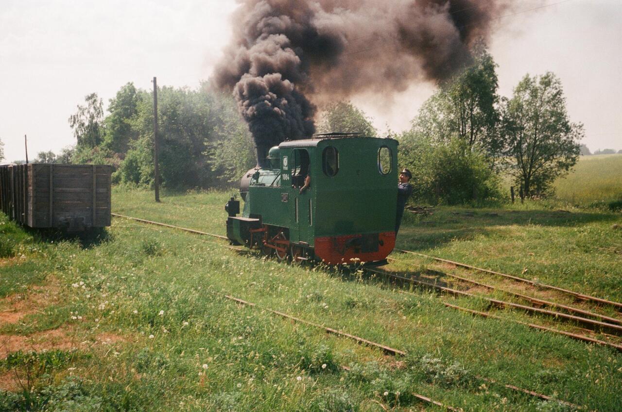 Pociąg OS 18155 relacji Ełk Wąskotorowy - Zawady Tworki, prowadzony lokomotywą Lyd1-220 wjeżdża na stację.