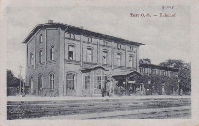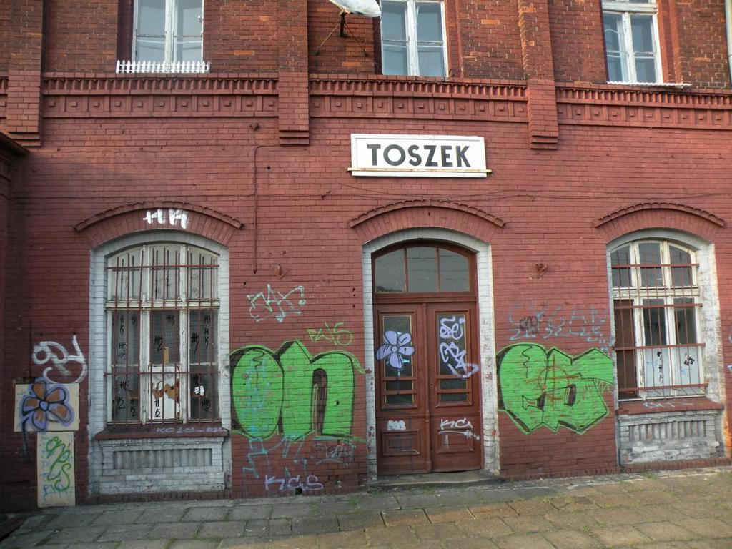 Stacja PKP Toszek. Budynek dworcowy. Przed nim dwa perony i kilka dodatkowych torów. Niektóre z nich są już bardzo wysoko zarośnięte. W lewo Strzelce Opolskie, w prawo Paczyna/Gliwice.
