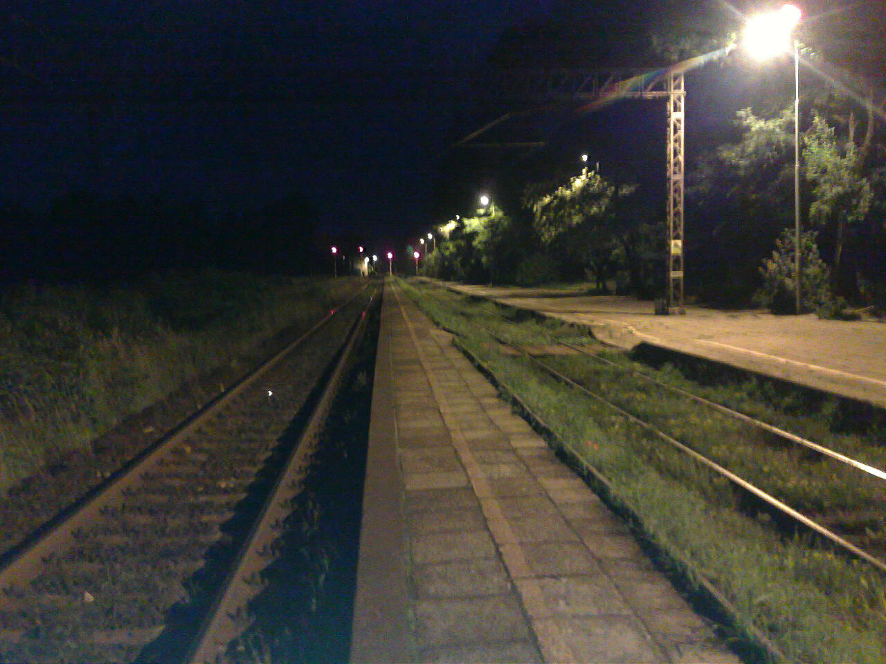 Stacja Toszek nocą. Widok na perony w stronę Strzelec Opolskich/Opola.