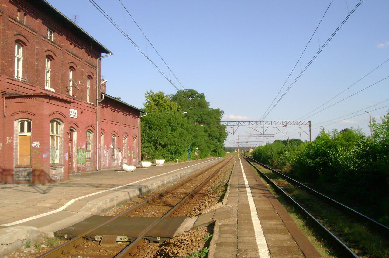 Toszek budynek dworca. W lewo Strzelce Opolskie, w prawo Paczyna/Gliwice.