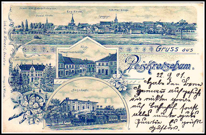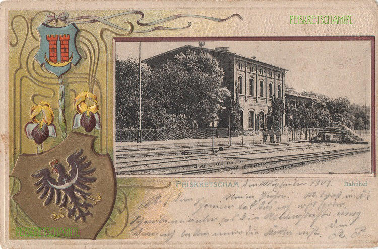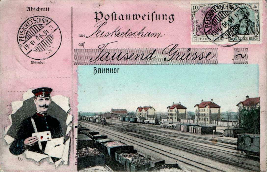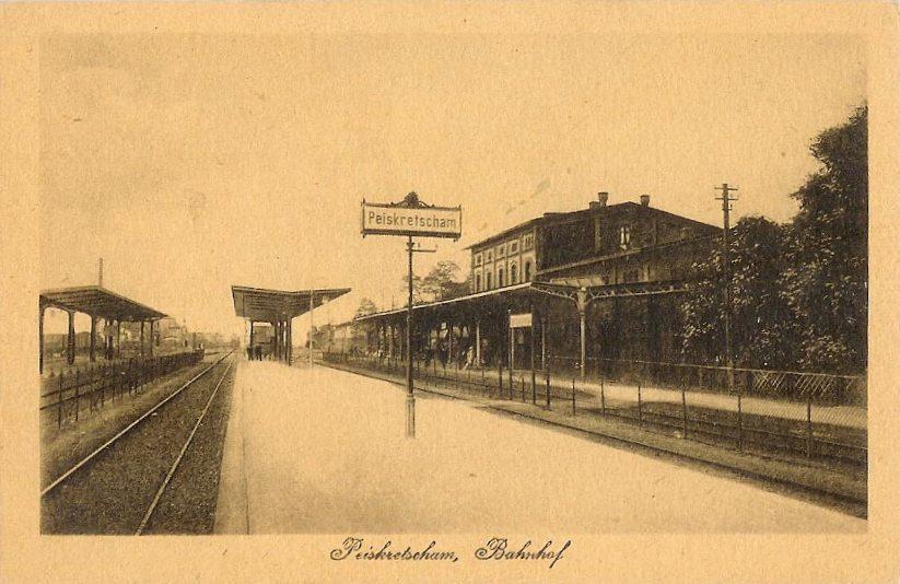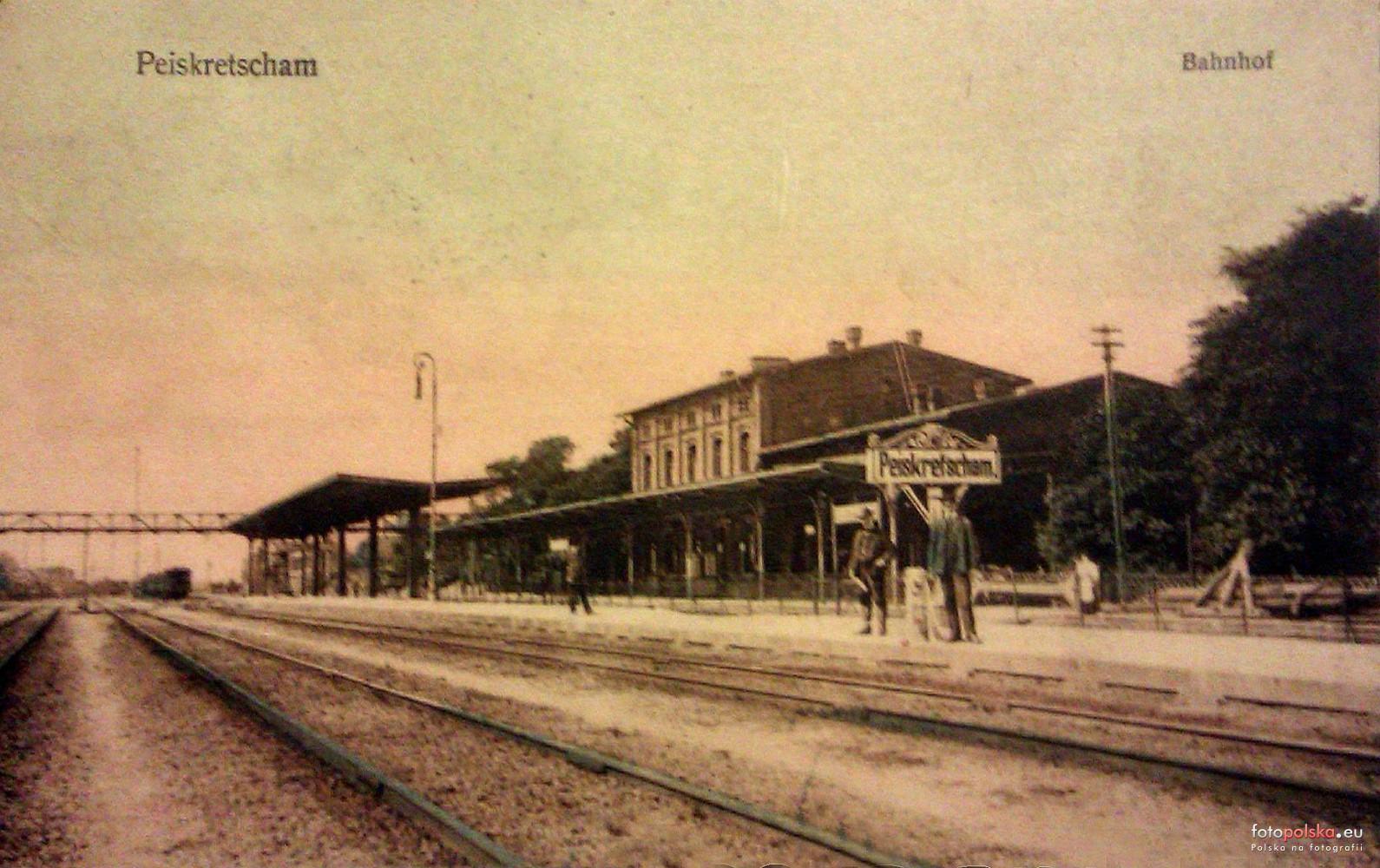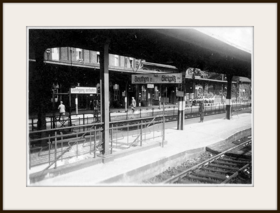 Stara pocztówka z widokiem stacji. Z prawej kolejowe budynki mieszkalne przy obecnej ul. Wolności. Widok z końca peronów w kierunku północno-zachodnim (Paczyna/Opole, kiedyś także Pyskowice Miasto).