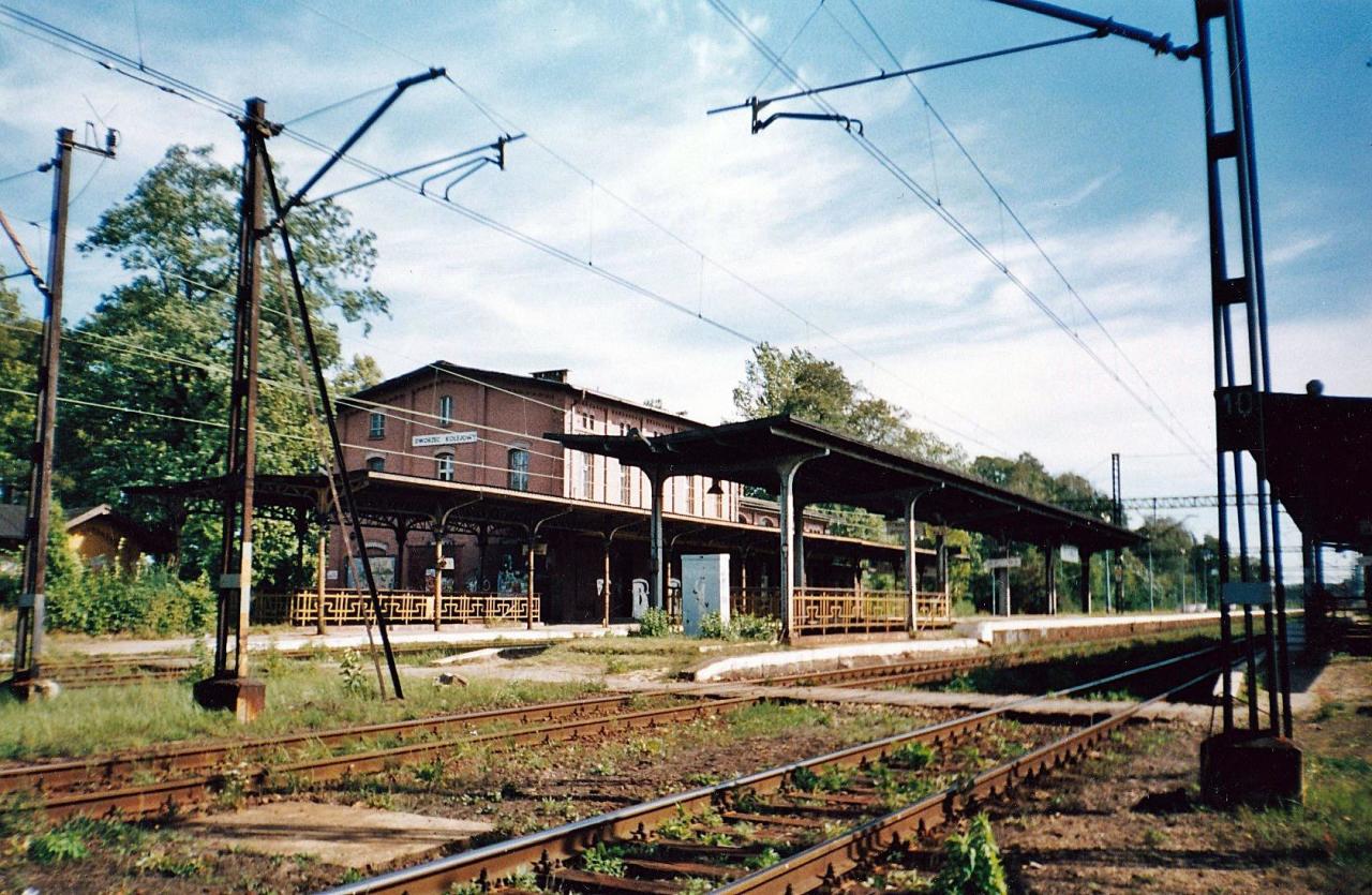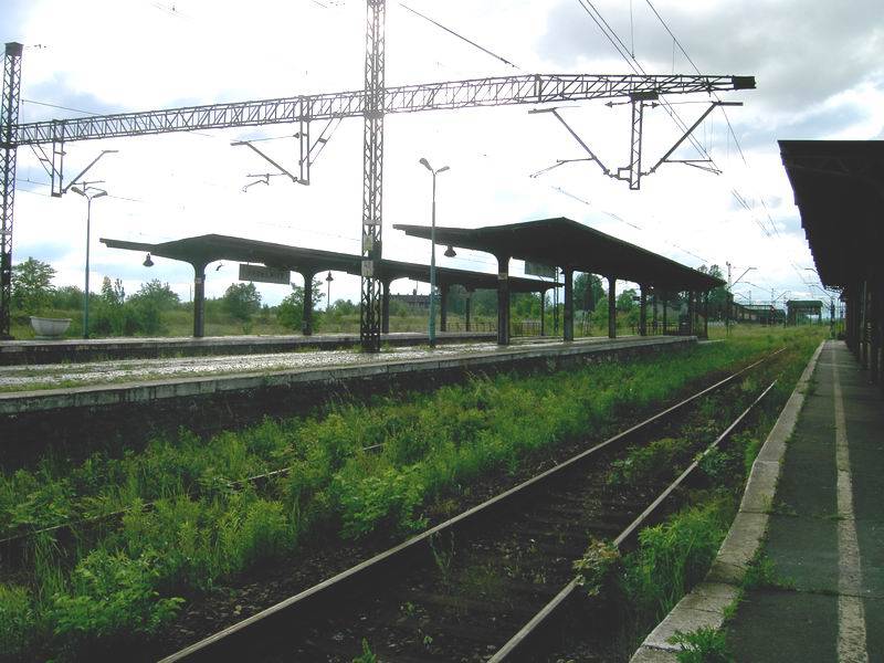 Perony (od prawej): 3, 2, 1 (jeszcze zadaszony) z budynkiem dworca. Widok od strony wjazdów z Paczyny/Opola, kiedyś także Pyskowic Miasto w kierunku południowo-wschodnim.
