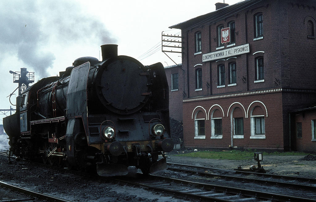 Ty45 udaje się w kierunku pyskowickiego lokomotywowni, której budynek socjalno-biurowy widoczny jest z prawej strony kadru.