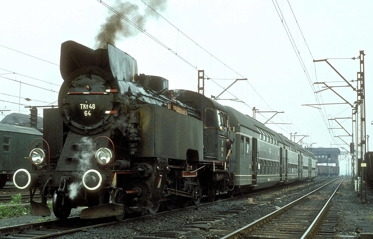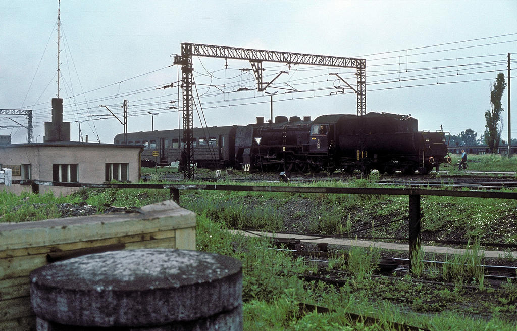 Tekatka z zestawem Bipa na stacji w Pyskowicach. Jest to najprawdopodobniej skład pasażerski w/z kierunku Bytomia, gdyż ten kierunek pyskowickiego węzła został zelektryfikowany po wykonaniu tej fotki. W tle nastawnia bramowa Pk 5. Widok od strony wjazdów z Paczyny/Opola, Pyskowic Miasto w kierunku południowo-wschodnim.