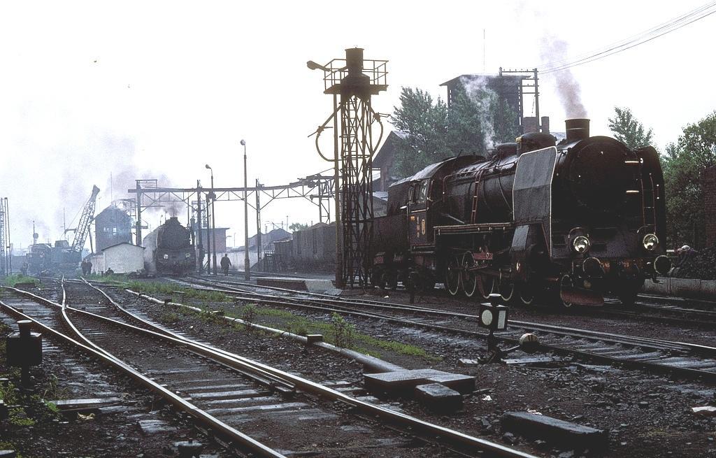Ceremoniał obrządzania parowozów. Z przodu Ty45 tankuje piasek, w tle drugi Ty45 na stanowisku nawadniania. Kadr wprost pachnie węglem, siarką i olejem. Widok od strony wjazdów z Paczyny/Opola, Pyskowic Miasto w kierunku południowo-wschodnim.