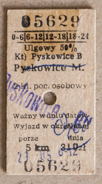 Bilet kartonikowy wydany na stacji Pyskowice. Relacja Pyskowice - Pyskowice Miasto - linia już nieistnieje.