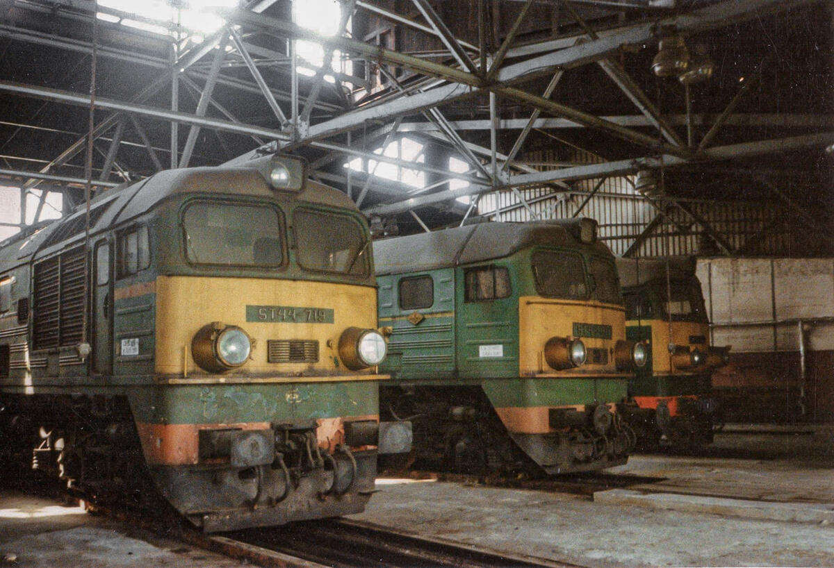 ST44-719 w towarzystwie dwóch kolejnych, o nieustalonych numerach, odstawione na terenie wyłączonej z użytku parowozowni Pyskowice, 199?r. (fot. John Graham ze zbiorów Piotra Borowiak).
