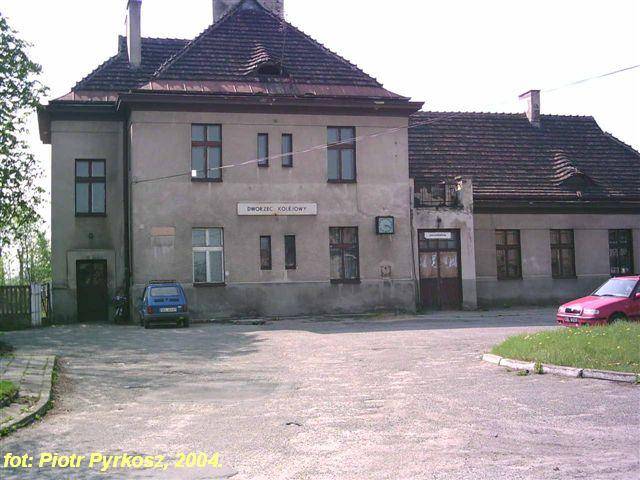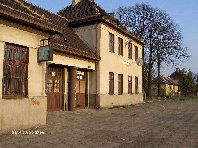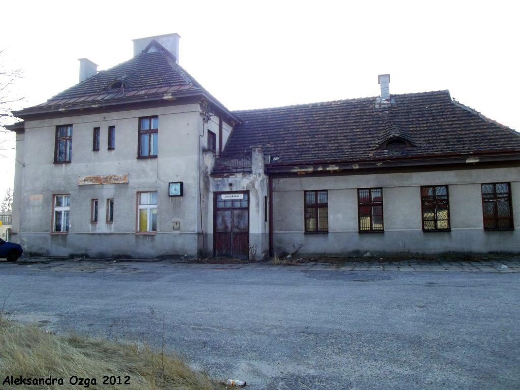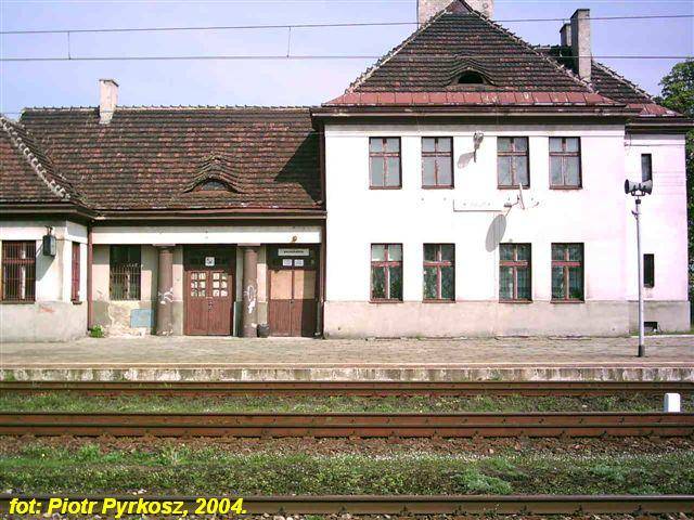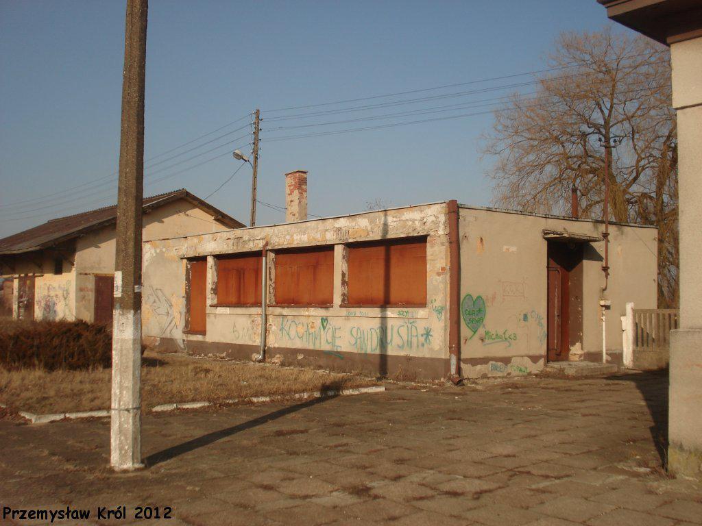 Jeden z nieczynnych budynków stacyjnych stojący wele budynku dworca (z prawej, poza kadrem). Widok w kierunku północno-wschodnim, od strony peronów.