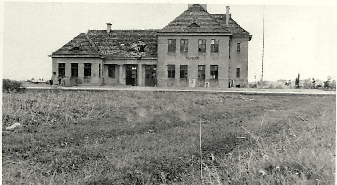 Dworzec od strony torów (uszkodzony w wyniku działań wojennych?). Widok w kierunku wschodnim; w lewo Chorzew Siemkowice, w prawo Herby Nowe.
