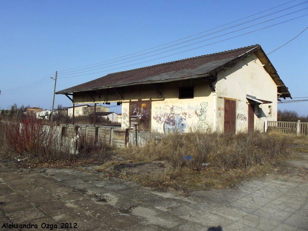 Magazyn towarowy z rampą. W tle plac przeładunkowy. Z lewej perony. Widok w kierunku północnym (Chorzew Siemkowice).