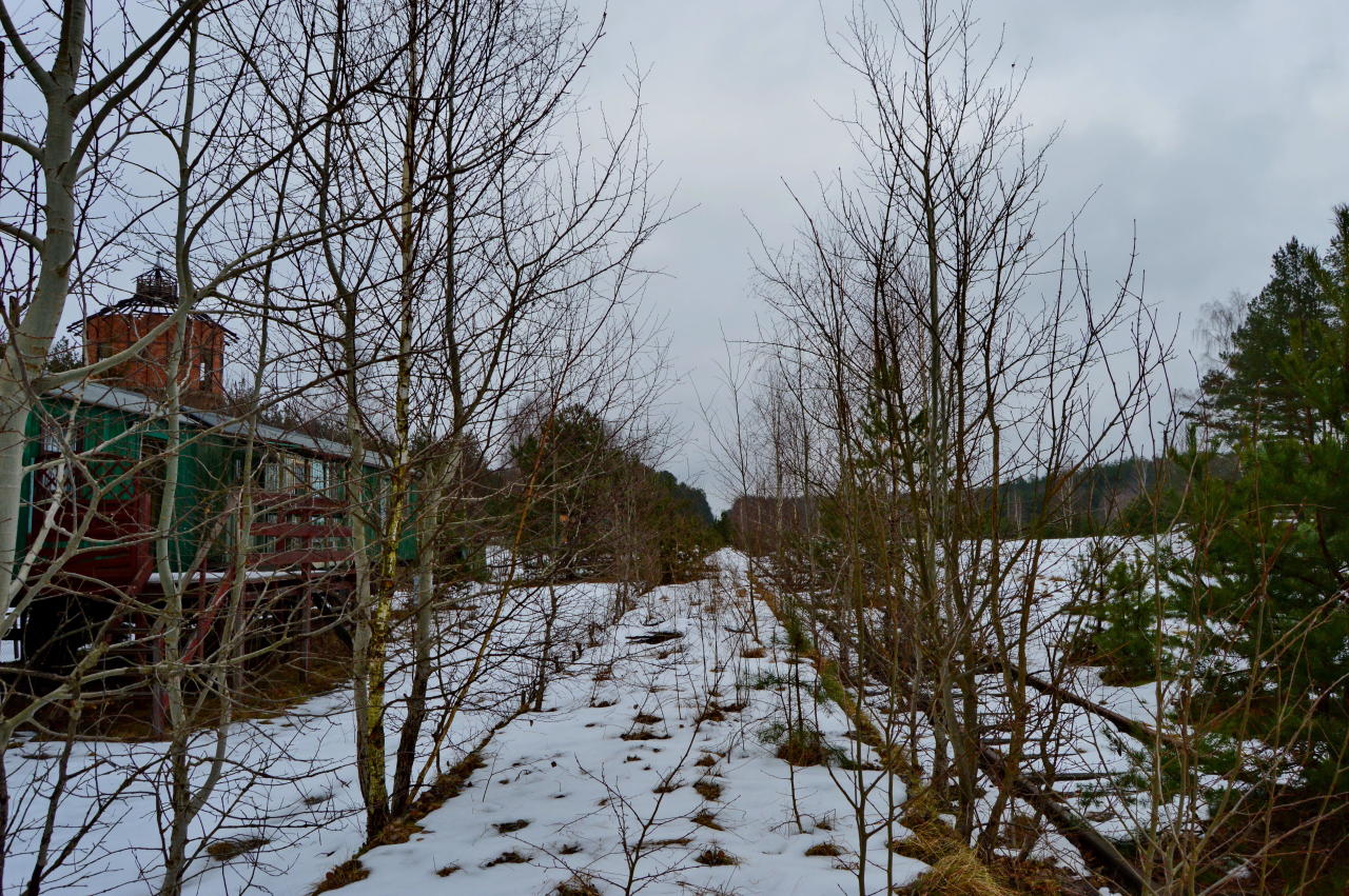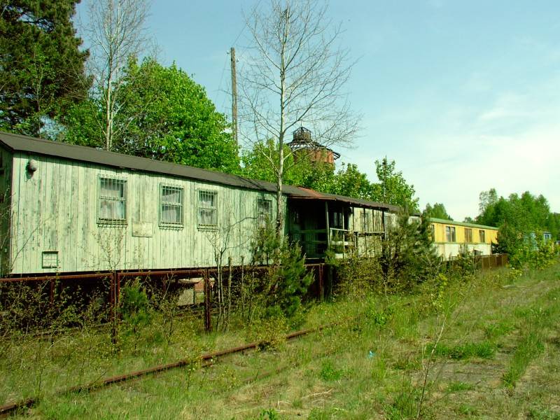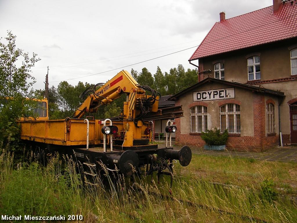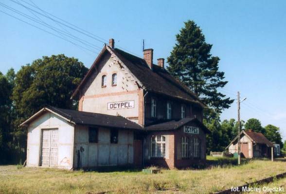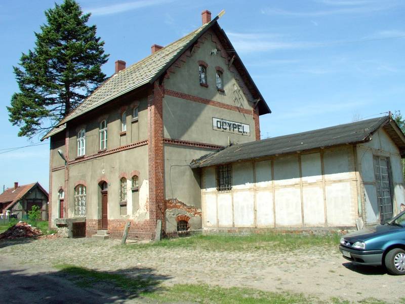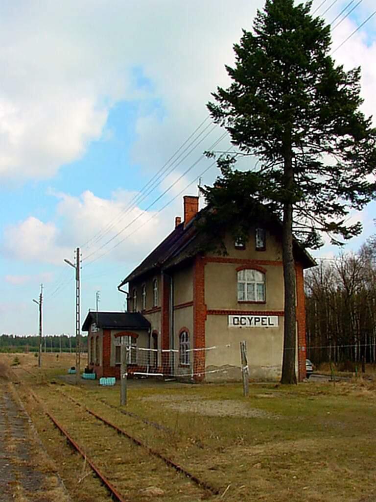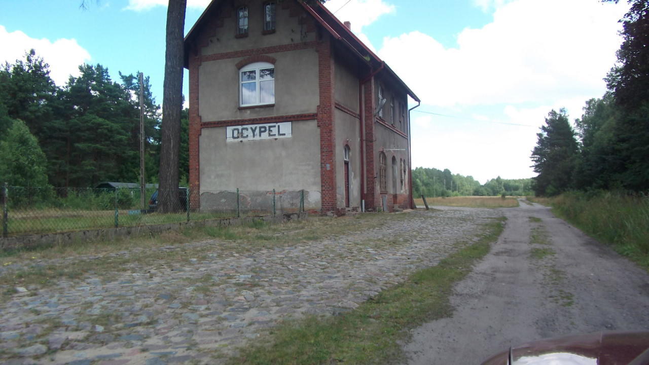 Ocypel - stare wagony stojące na nieczynnej już stacji. Drzewa na torowisku wskazują na to, że już od dawna nie przejechał tędy żaden pociąg. Po lewej stronie stara wieża ciśnień.