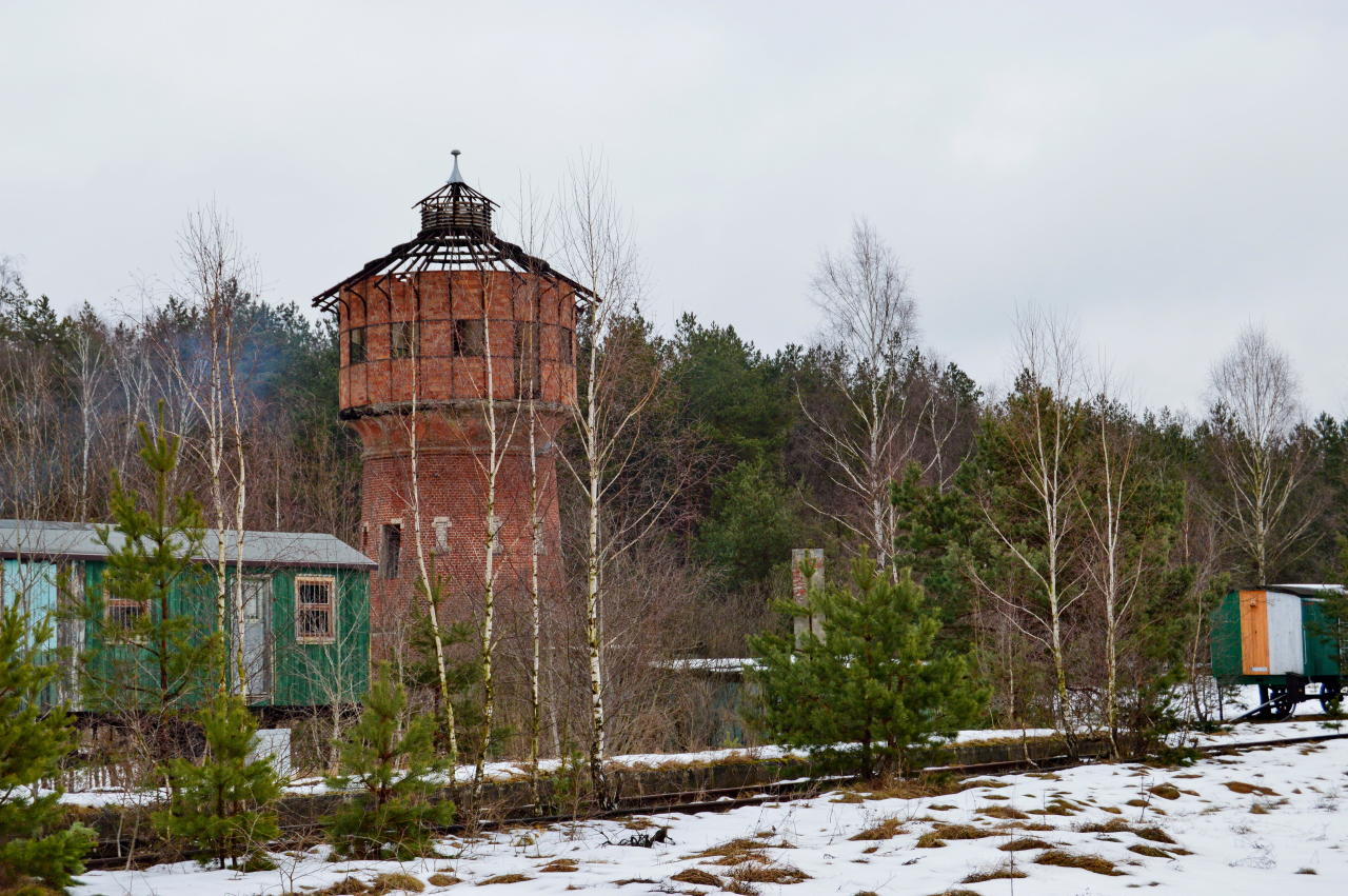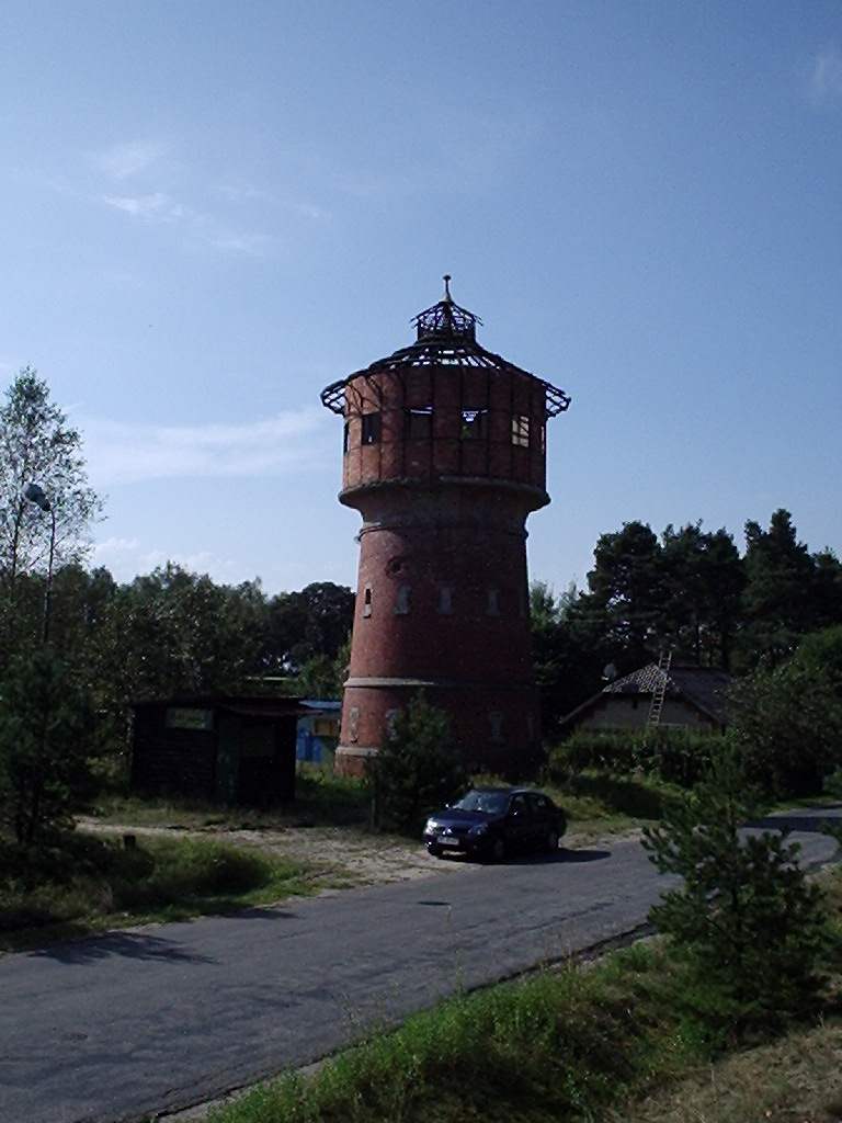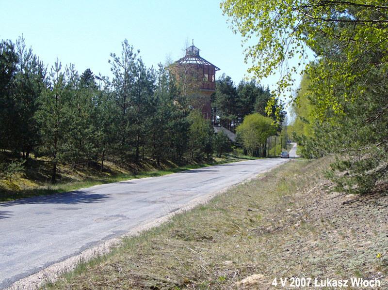 Wieża wodna widziana od strony drogi z Lubichowa. Torowisko znajduje się z lewej strony, za drzewami.