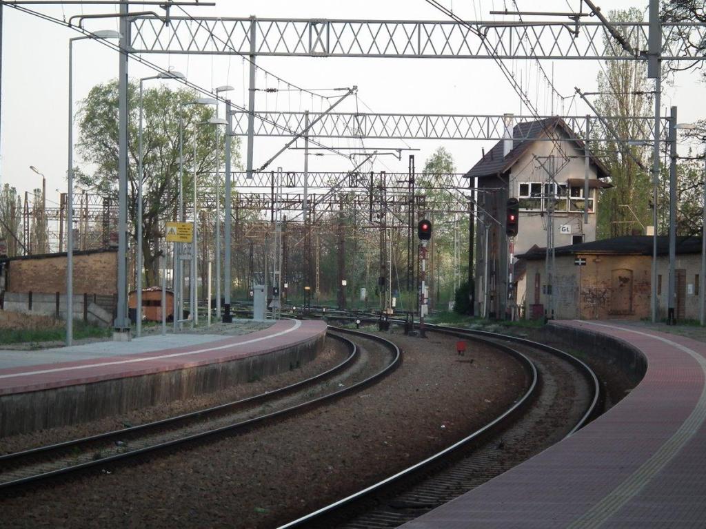 Widok z peronu 3 na peron 2 i posterunek przejazdowy przy ul. Wolności (z prawej). W lewo stacja Gliwice, w prawo Pyskowice.