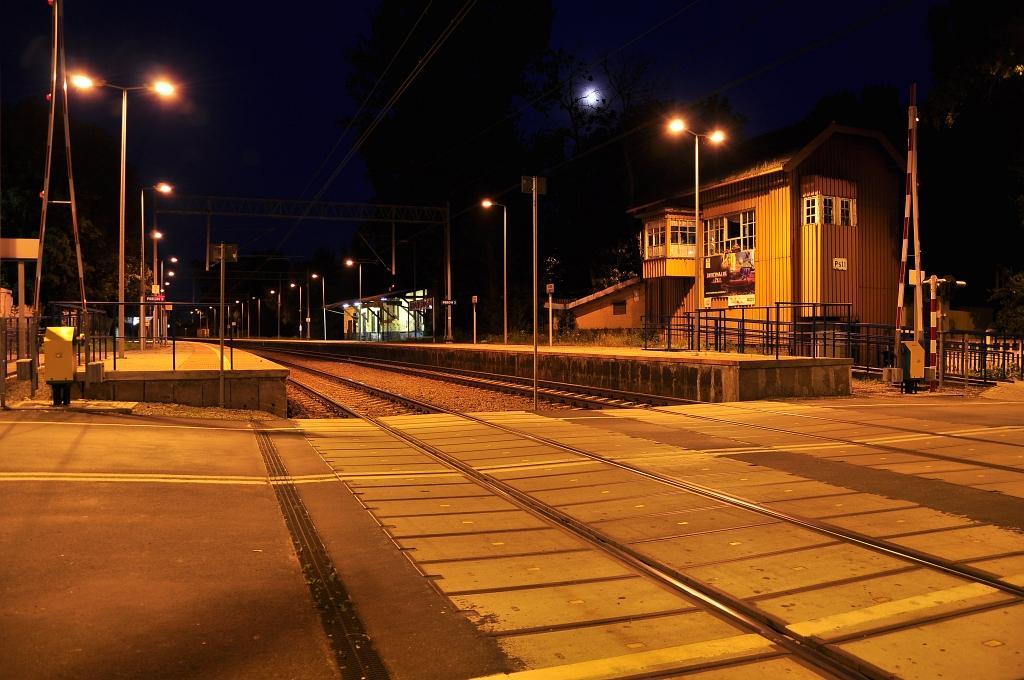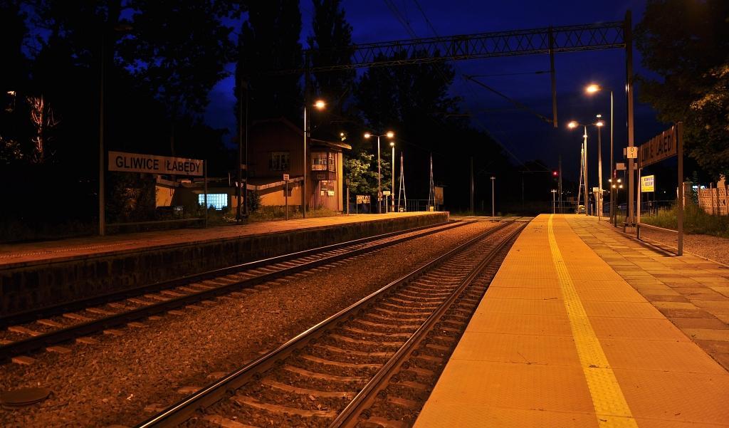 Gliwice Łabędy - peron 1 o zachodzie słońca, widok w kierunku Rudzińca Gliwickiego/Kędzierzyna-Koźla.