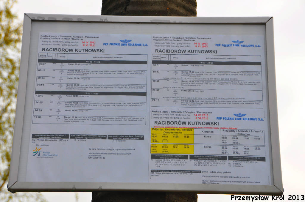 Opis ogólny: Po zmianie w rozkładzie od 10.12.2006 na stacji nie zatrzymują się pociągi pasażerskie (konkretnie jeden pociąg) "do odwołania" więc może już nigdy się nie będą zatrzymywać... (info: Krzysztof Marciniak, 2007-01-23) Wg. rozkładu obowiązującego do 13.12.08 z tej stacji pociągami dojechać można do KUTNA i SIERPCA.Stacja posiada tablicę z napisem RACIBORÓW KUTNOWSKI. (info: ADAM PIOTROWSKI , 2007-12-22) Do miejscowości Sójki, na wschód, biegła kilkukilometrowa bocznica do miejscowej żwirowni. (info: Krzysztof Marciniak, 26-03-2008) |