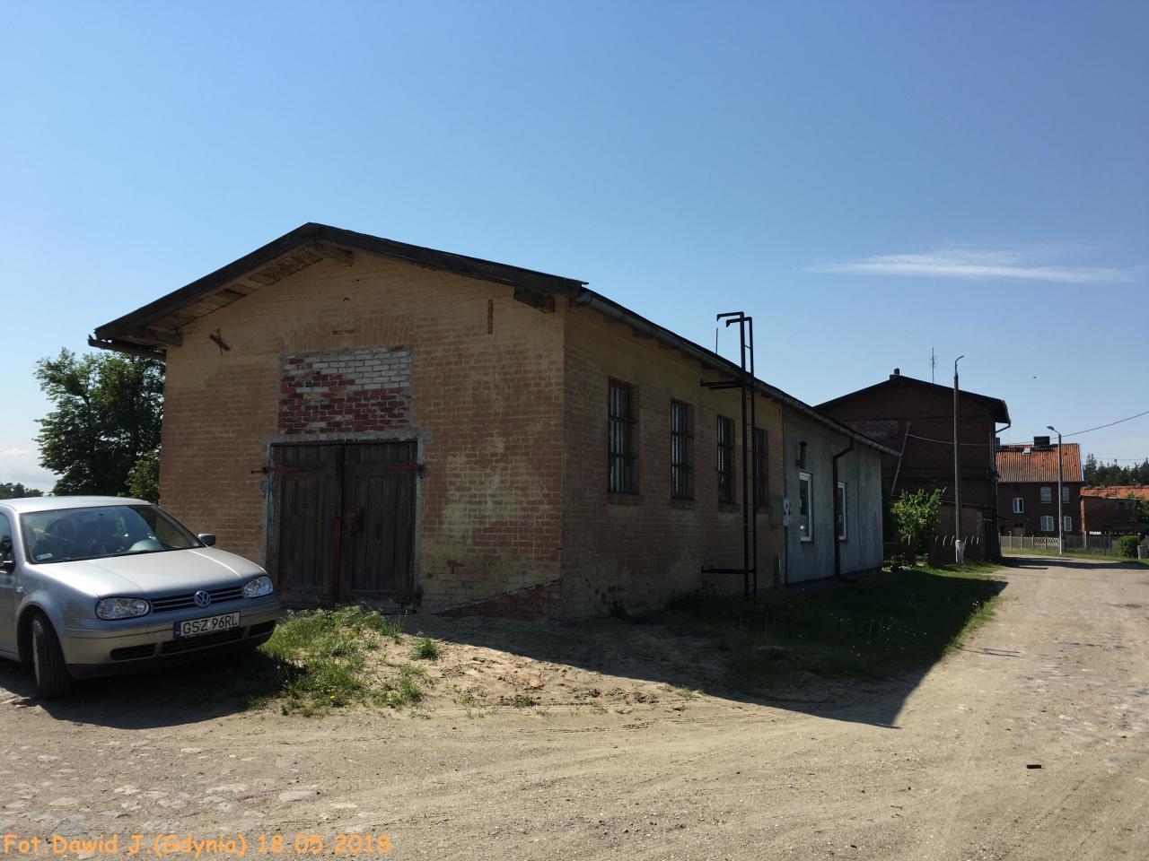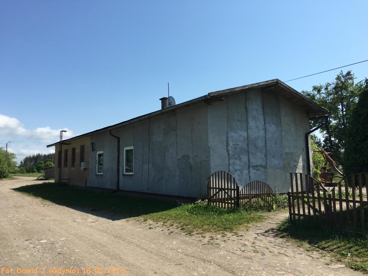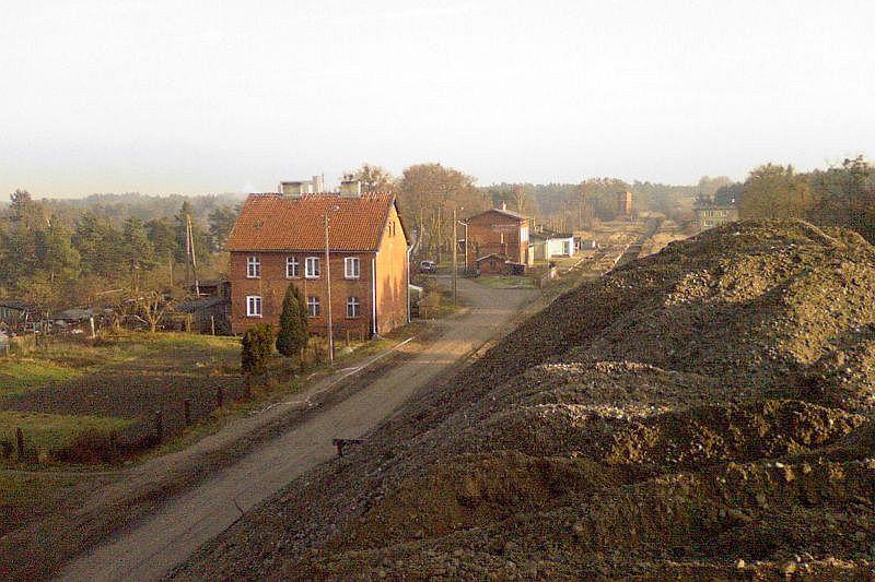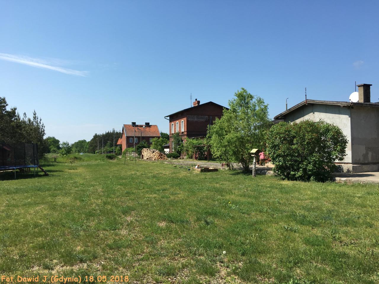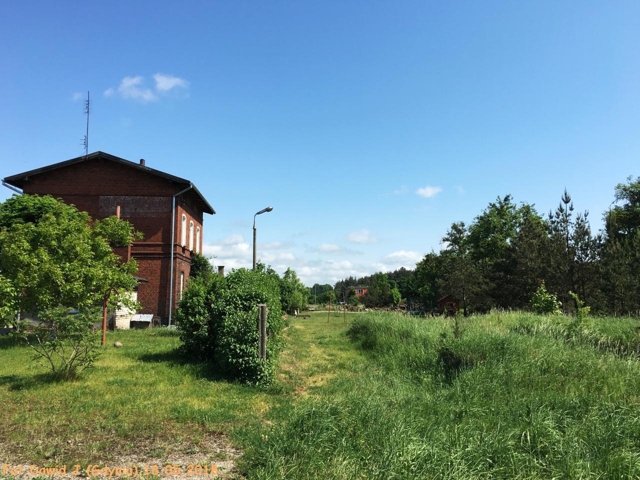 Widok z miejsca gdzie kiedyś były tory w kierunku Małdyt. Po prawej stronie zamieszkały budynek towarzyszący.