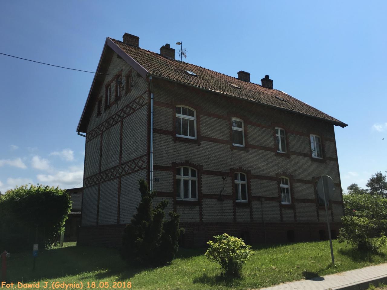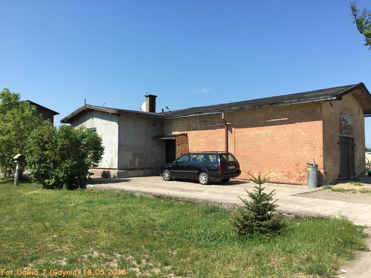 Widok z miejsca gdzie kiedyś były tory w kierunku Malborka. Budynek dworcowy, zamieszkały budynek towarzyszący 1,2,3 po prawej stronie.