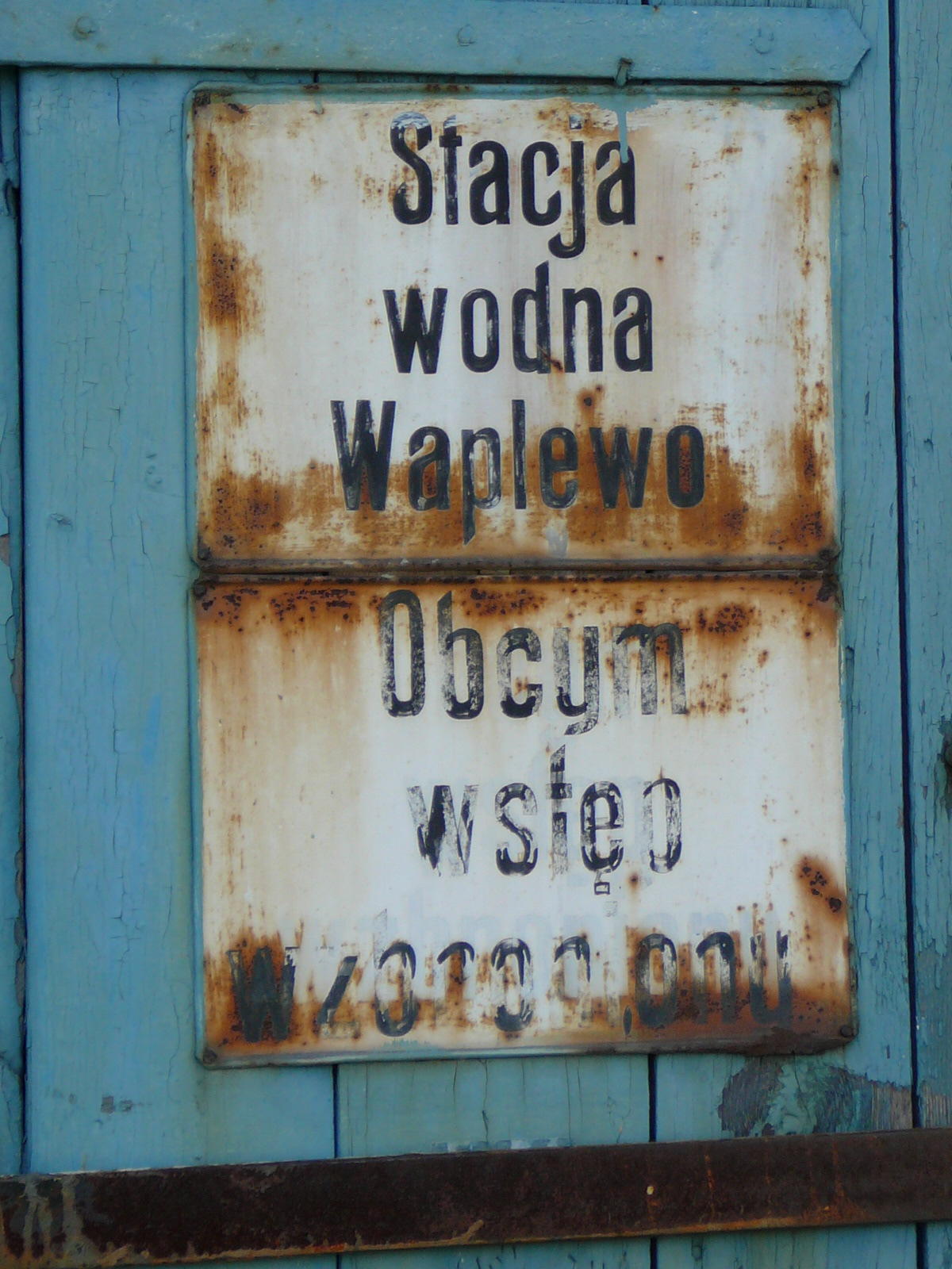 Waplewo Wielkie. Napis na drzwiach wieży wodnej.