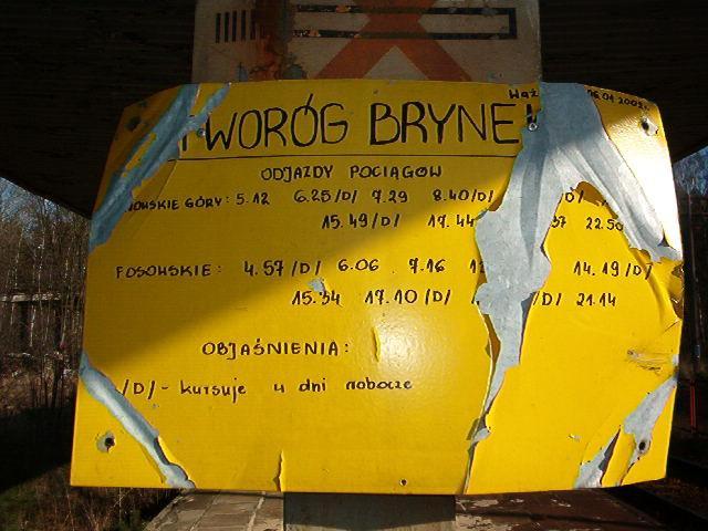 Opis ogólny: Na terenie byłej stacji nie ma już żadnych torów poza jednym (torem przy peronie 1 - jedynym używanym), na którym zatrzymują się pociągi pasażerskie (trakcji elektrycznej oczywiście też nie ma). Drugi peron niszczeje i rosną na nim półtorametrowe iglaki. W miejscu dawnego budynku dworca leży obecnie kupa gruzów. (info: Krzysztof Urbaniec, 2005-03-30)