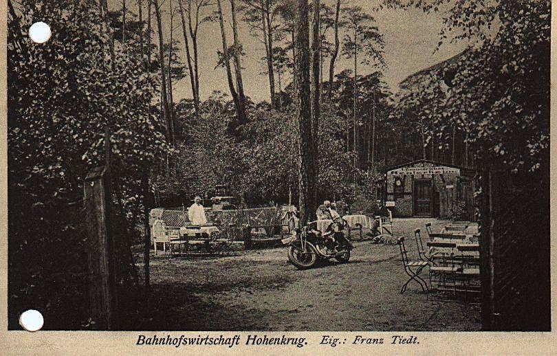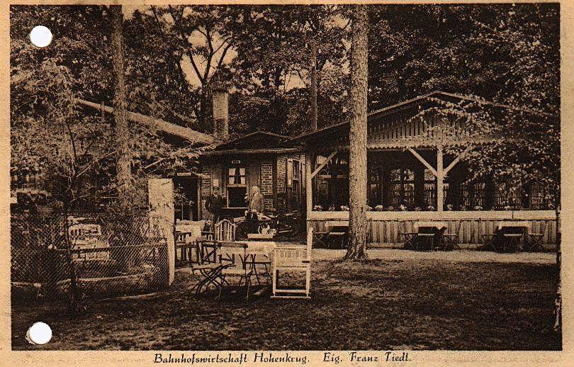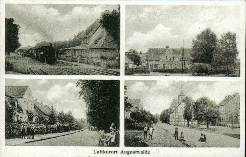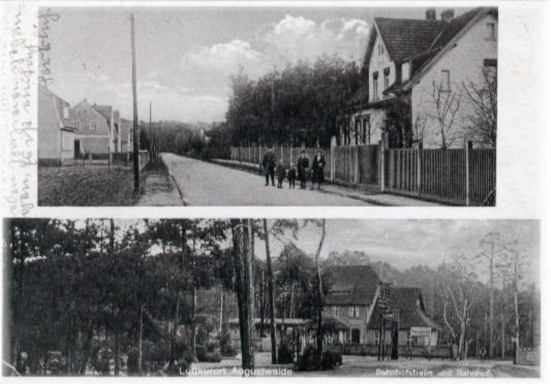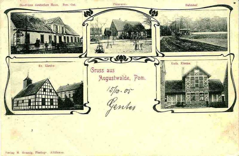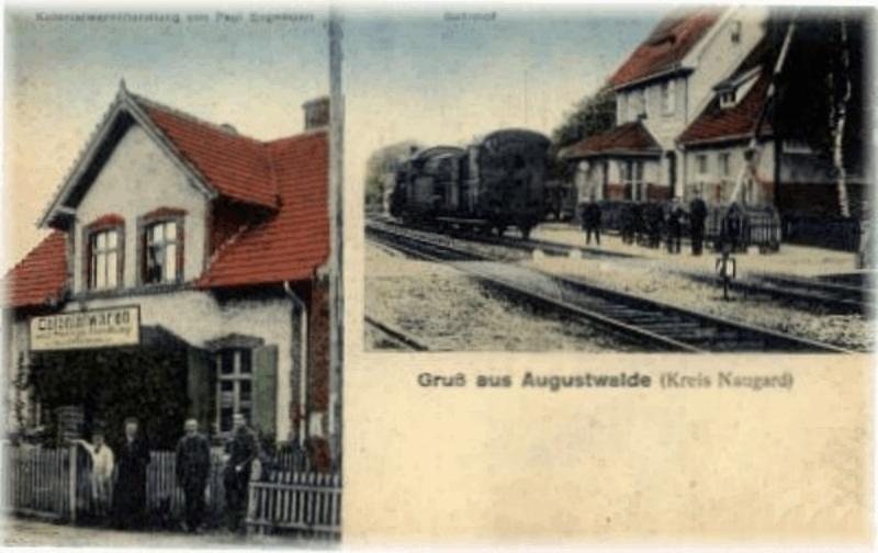 Stara pocztówka. Zabudowania dworcowe w prawym, górnym rogu pocztówki.