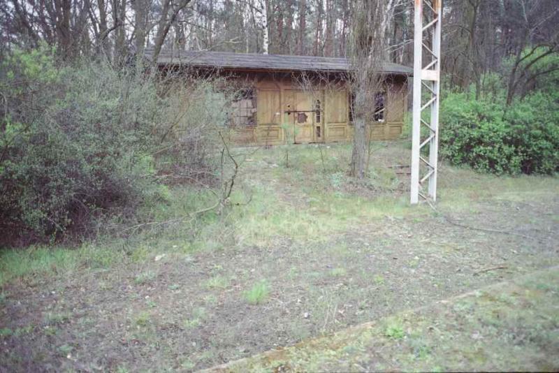 Widok na magazyn przy peronie Stargard Szcz. - Szczecin Gł., widoczne miejsce po torze dodatkowym, zdjęcie robione z peronu;