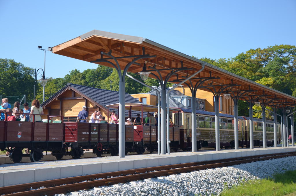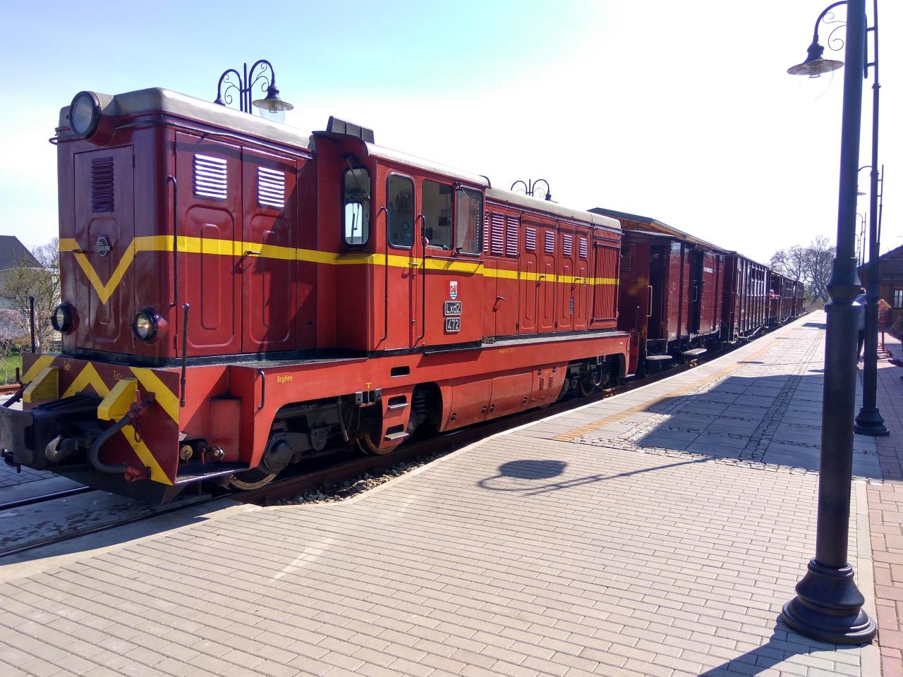 Początek sezonu turystycznego na stacji w Trzęsaczu. Odrestaurowana lokomotywa Lxd2 za moment wyruszy z turystami w kierunku Pogorzelicy.