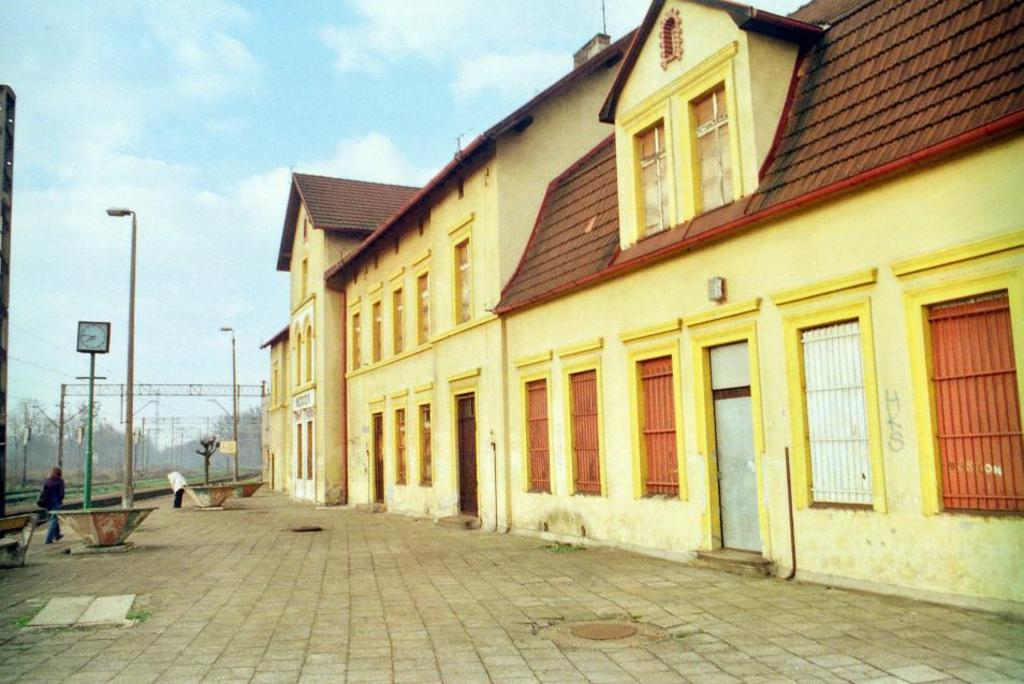 Zdewastowany budynek stacyjny, strona zachodnia (kędzierzyńska) z peronami 1 i 2. W tle nastawnia wykonawcza Na1. Widok w kierunku północnym (Kędzierzyn-Koźle).