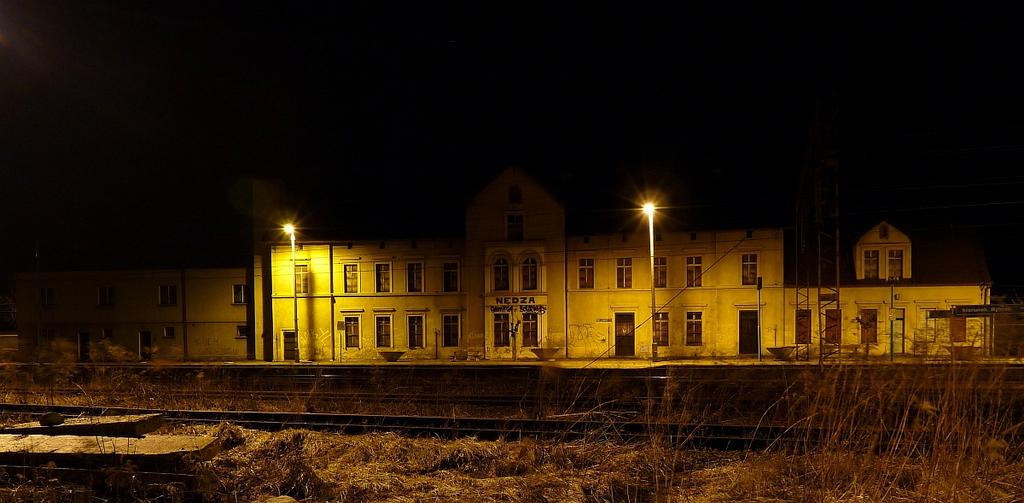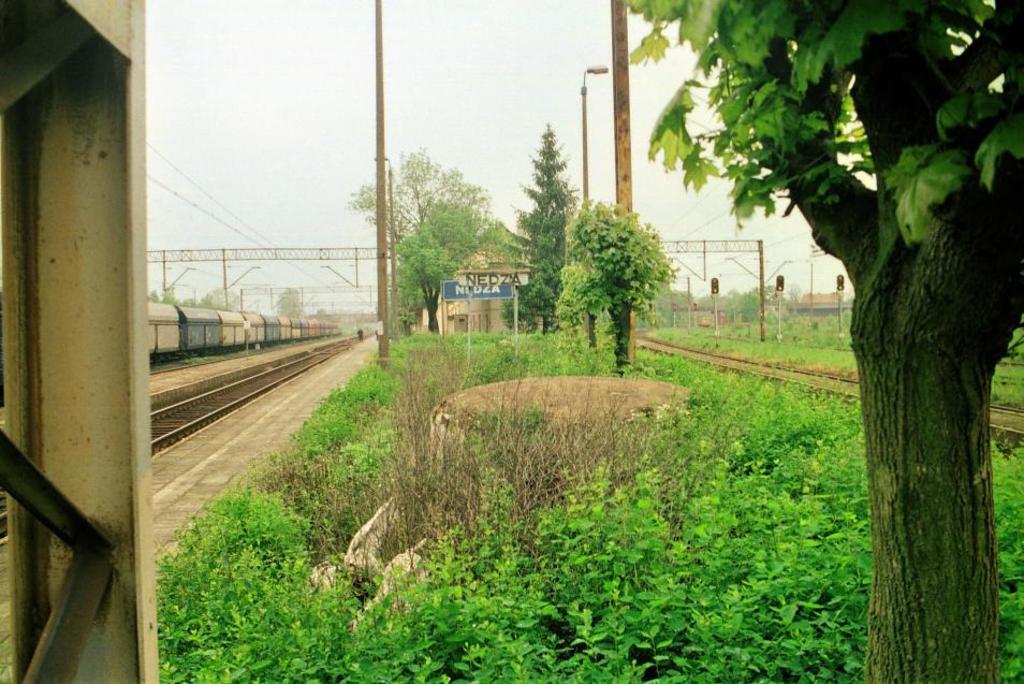 Nędza - stacja, widok od strony Raciborza na niegdyś piękny skwer znajdujący się pomiędzy zachodnią (z lewej) i wschodnią (z prawej) częścią stacji. Z lewej perony 1 i 2 w stronę Kędzierzyna-Koźla, z prawej perony 3 i 4 w stronę Suminy/Rybnika. Widok w kierunku północnym.