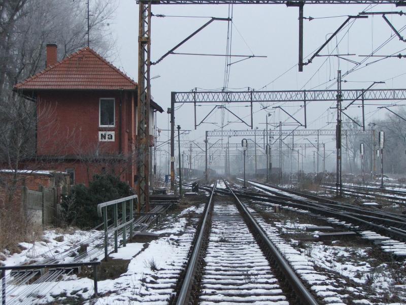 Nastawnia wykonawcza Na1. W tle wiadukt drogowy w ciągu ul. 1 maja. Widok w kierunku północno-wschodnim (Kędzierzyn-Koźle).