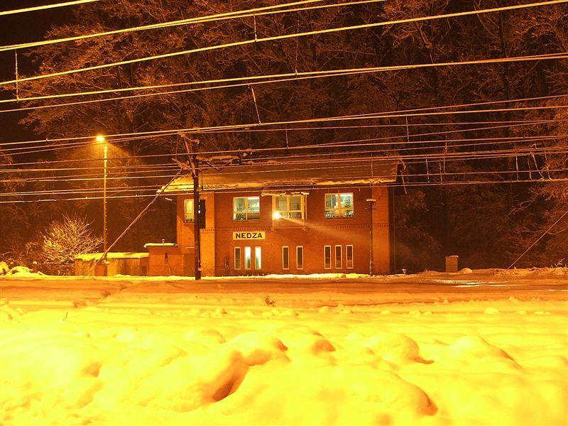 Nędza - nastawnia dysponująca w śnieżnej scenerii. Widok w kierunku zachodnim; w lewo Racibórz Markowice (dalej stacja Racibórz i Olza), w prawo perony.