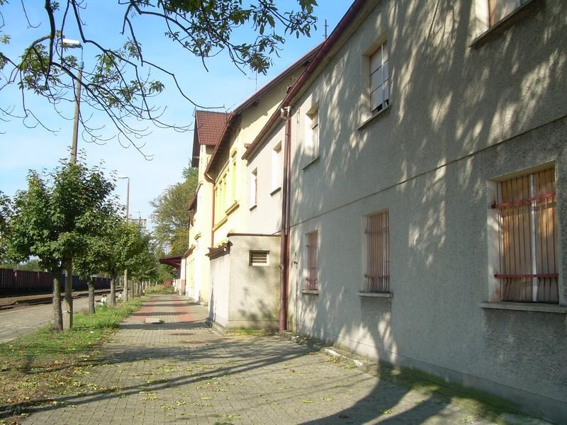 Budynek dworca. Widok na budynek dworca od strony "rybnickiej" (wschodniej). Widok w kierunku zachodnim; w prawo Rybnik, w lewo Racibórz Markowice (dalej stacja Racibórz i Olza).