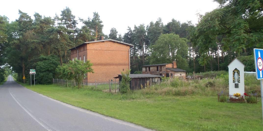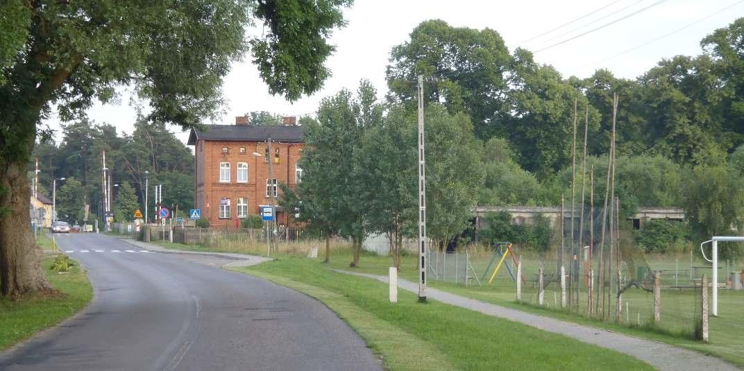 Budynki w pobliżu stacji, szosa na Ińsko, dalej wzdłuż tej drogi linia wąskotorowa;