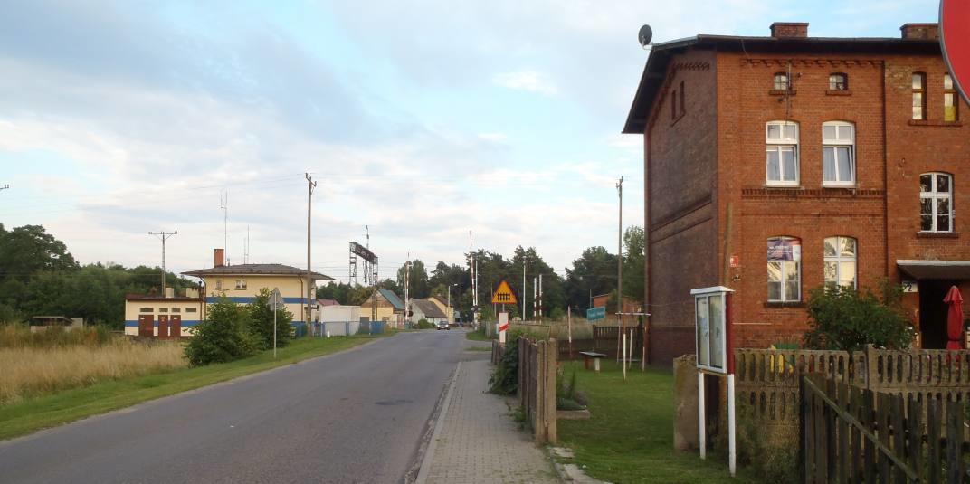 Przejazd kolejowy w obrębie stacji, na lewo perony stacyjne (kierunek Ulikowo), na prawo Chociwel;