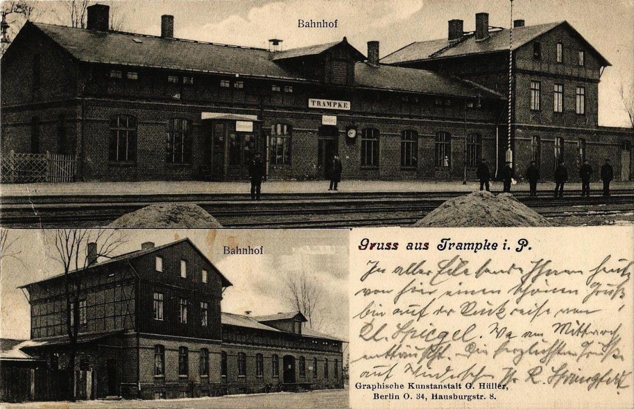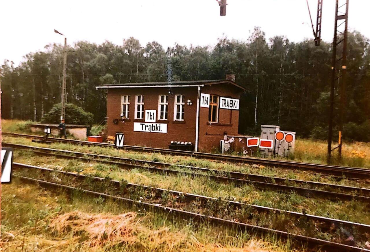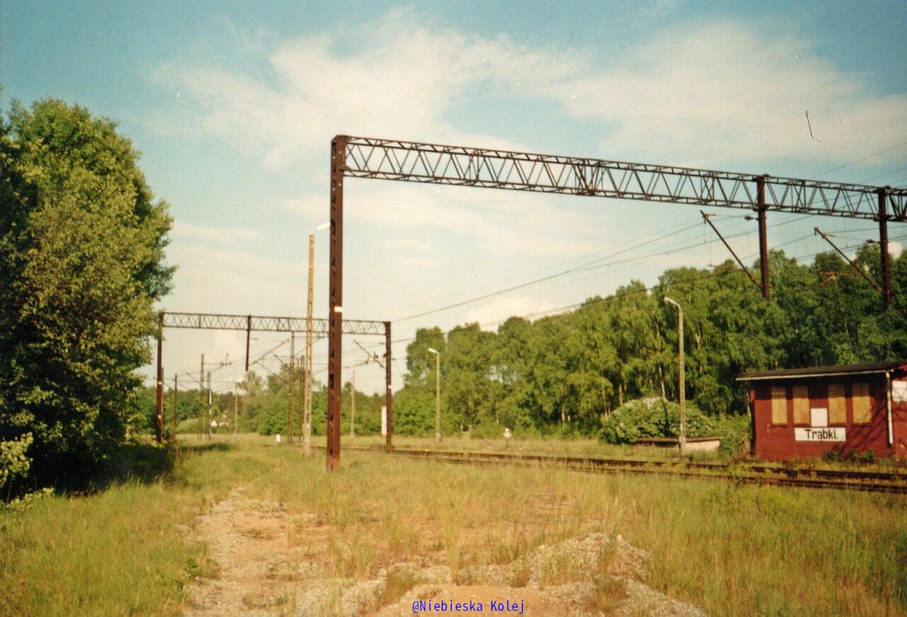Trąbki po lewej, Trąbki Wąskotorowe po prawej (tory w trawie przechodzące z miejsca robienia zdjęcia w kierunku przez pierwsze od lewej drzewko iglaste), z pozostałych starszych zdjęć wynika, że jest to dokładne miejsce peronu osobowego Trąbek Wąskotorowych;