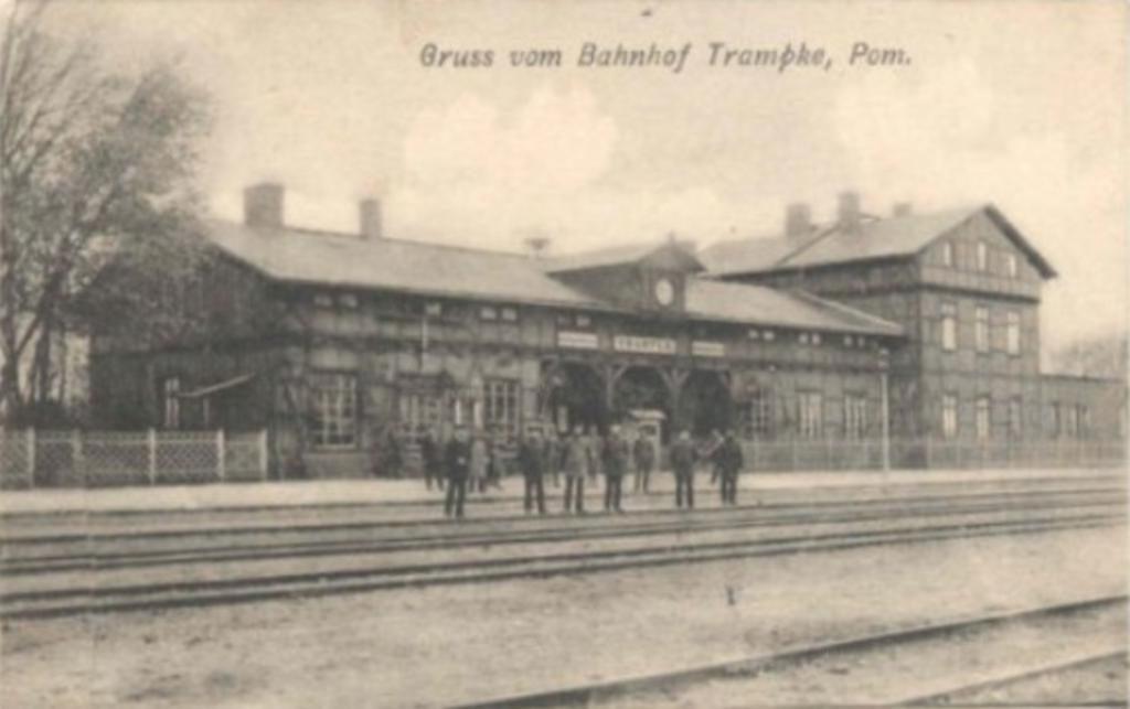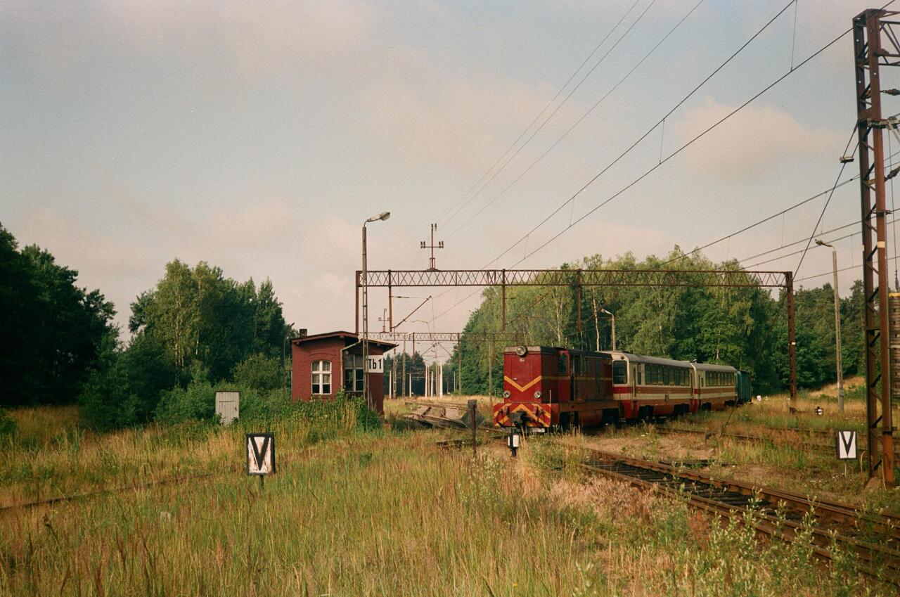 Skrzyżowanie linii wąskotorowej Stara Dąbrowa - Ińsko z linią normalnotorową nr 202 Gdańsk Główny - Stargard Szczeciński w Trąbkach, nastawnia wykonawcza Tb1 stacji normalnotorowej Trąbki. Pociąg MS 523 relacji Stargard Szczeciński Wąskotorowy - Trąbki Wąskotorowe, prowadzony lokomotywą Lxd2-469 zbliża się do stacji końcowej. Na lewo - kierunek Ińsko, na prawo - kierunek Stara Dąbrowa. Widok w kierunku stacji Stargard Szczeciński.
