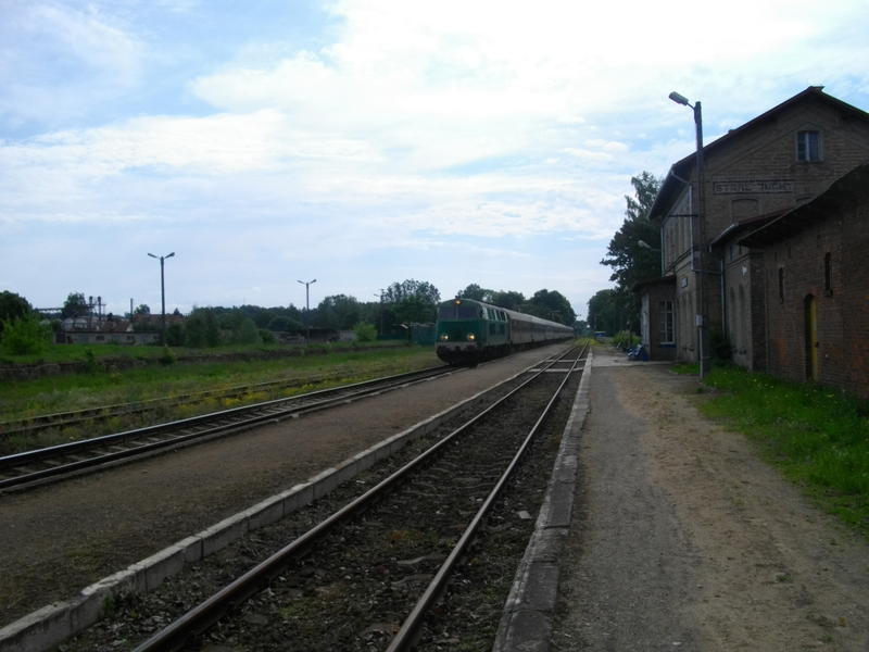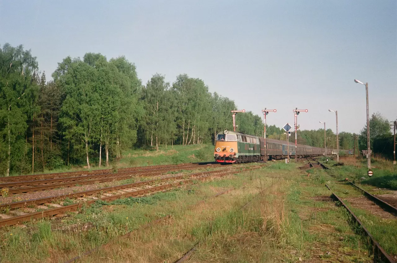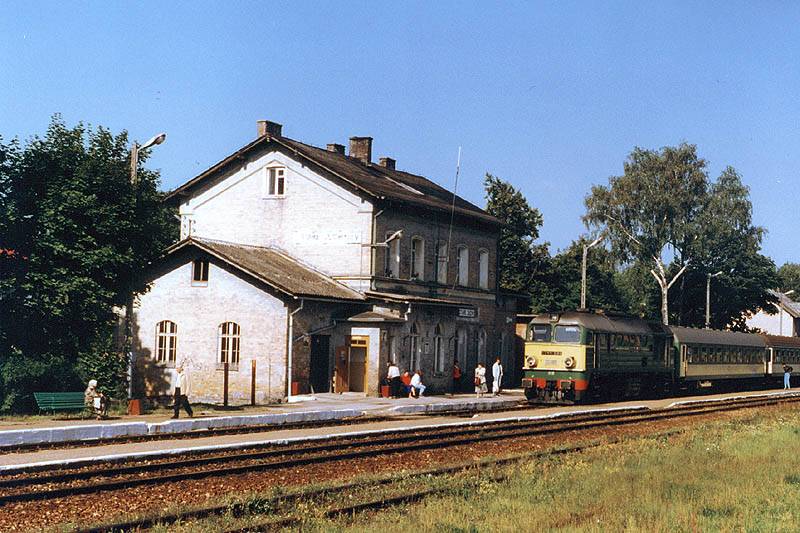 Stare Juchy. Pociąg pospieszny Rybak, z Białegostoku do Szczecina przejeżdża przez Stare Juchy. Z prawej zabudowania stacyjne; drugi budynek to dworzec z nastawnią dysponującą. Widok w kierunku Ełku/Białegostoku.