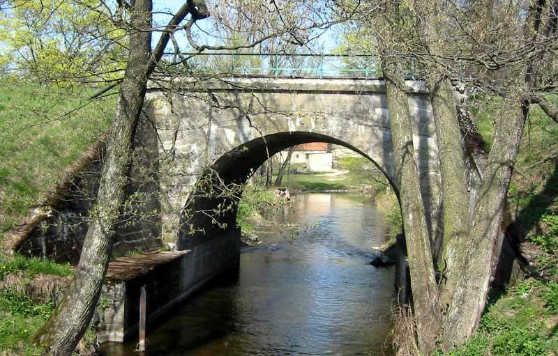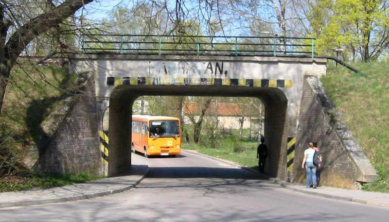 Stare Juchy. Wiadukt kolejowy nad drogą lokalną. W lewo perony, w prawo most nad kanałem Młyńska Struga i wyjazd do Ełku.