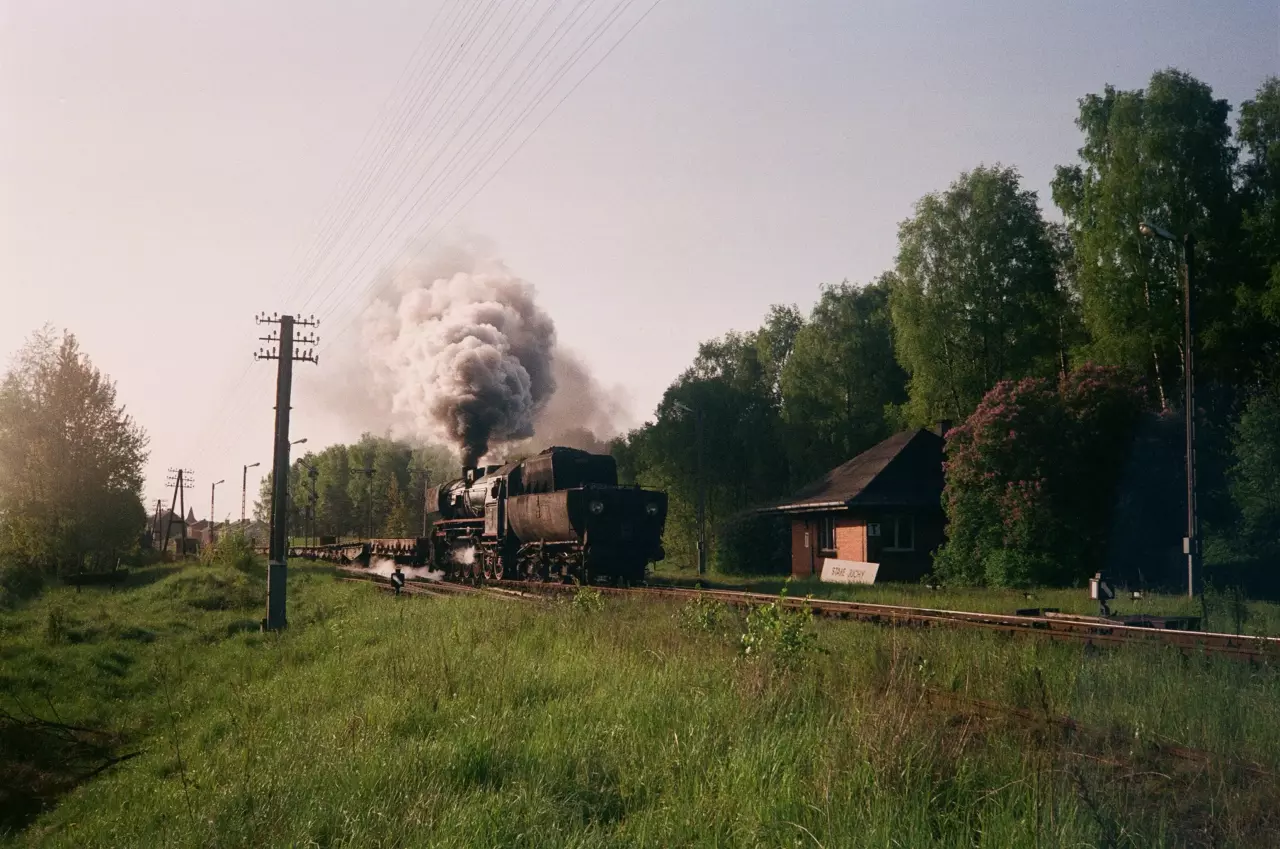 Stacja Stare Juchy - budynek stacyjny, tor 3 - pociąg TZ 98172 relacji Giżycko - Ełk Towarowy, prowadzony parowozem Ty2-1279 (MD Ełk), widok w kierunku stacji Giżycko (Głomno - Granica Państwa).