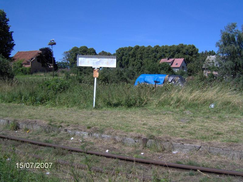 | perony: | Bardzo dziwne miejsce. Peron z krawędzią nie istnieje. Wysiada się na wydeptaną ścieżkę, na której stoi zamalowana tablica - kiedyś z nazwą miejscowości. Ta ścieżka ledwo się mieści między torem a ogrodzeniem. Od strony wsi jest drogowskaz. | |