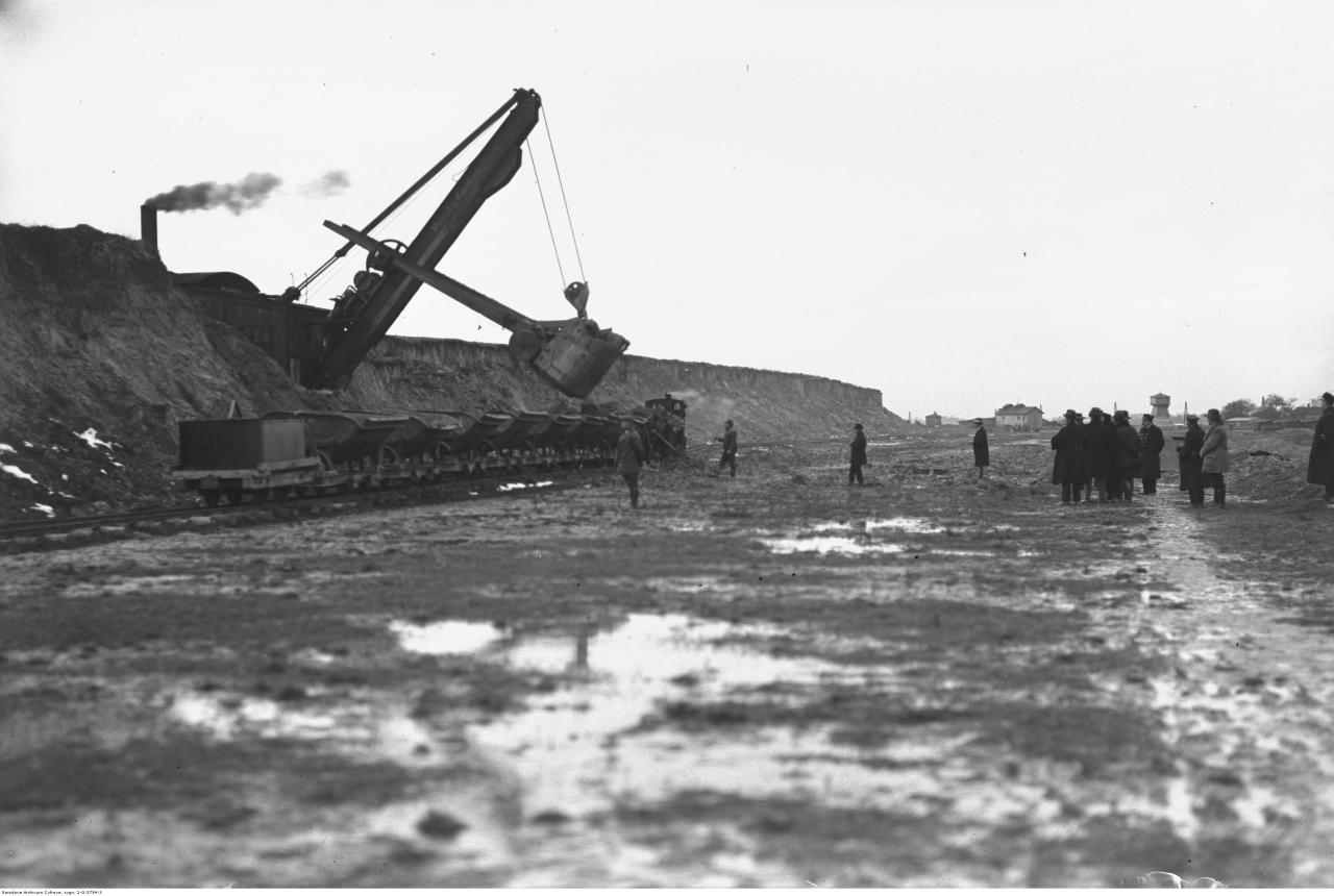 "Budowa stacji kolejowej. Łopata parowa podczas załadunku ziemi na wagoniki kolejki wąskotorowej".