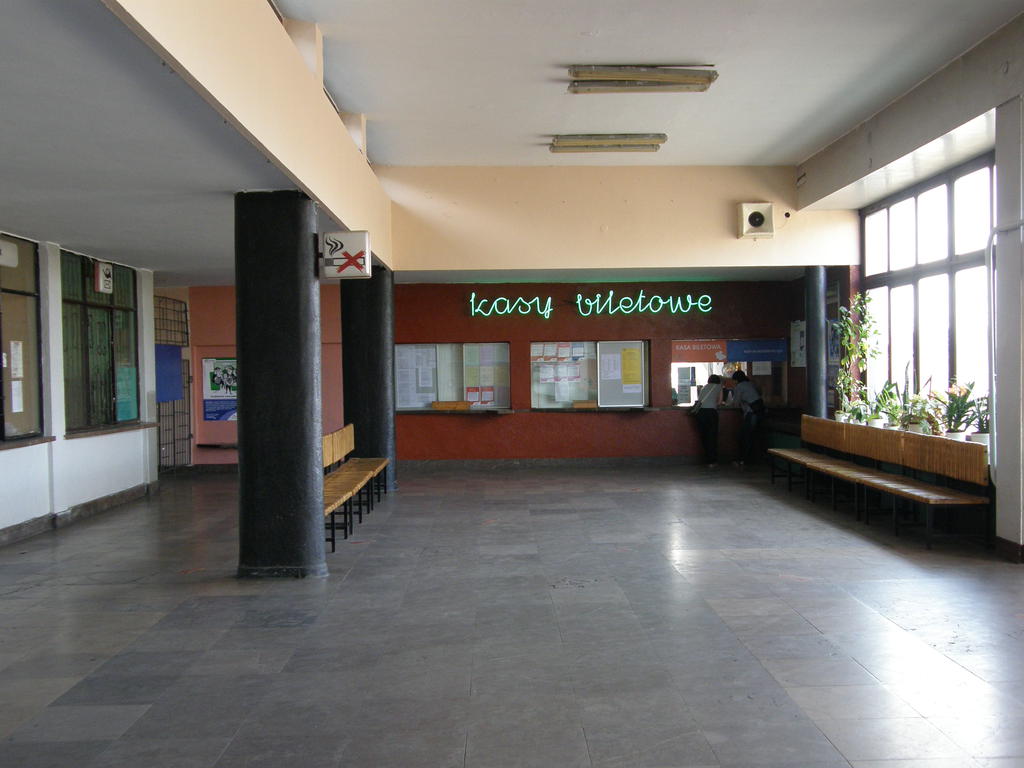 Budynek dworcowy wewnątrz. Hol główny. Neon "kasy biletowe". Widok w kierunku Czech i Jastrzębia-Zdroju. 76,4 km/ 13,1 km.