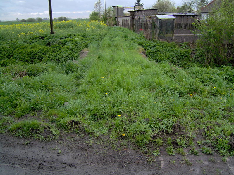 | Przy przystanku nadal widać tory w polnej drodze, a kawałek dalej przepust. kilkaset metrów dalej była ładownia Świerki Gdańskie. |