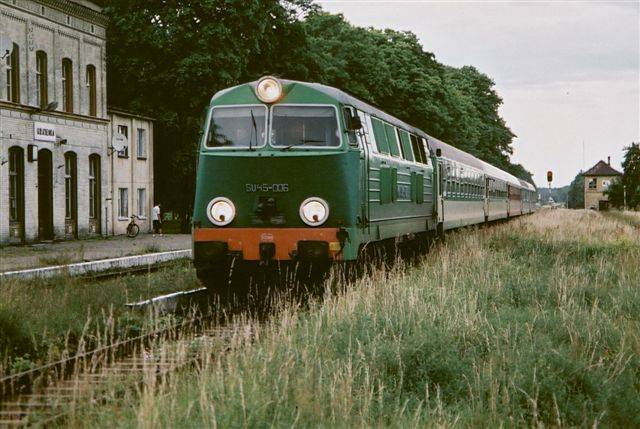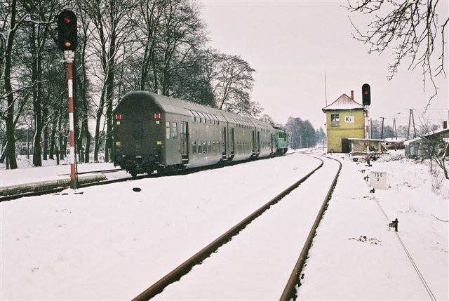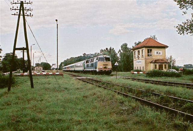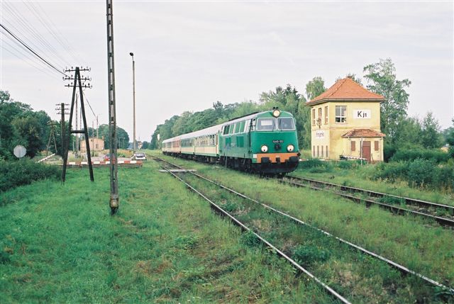 Blues Ex wjeżdża do Krajenki. Z lewej nastawnia wykonawcza Kj1. Widok w kierunku Piły.