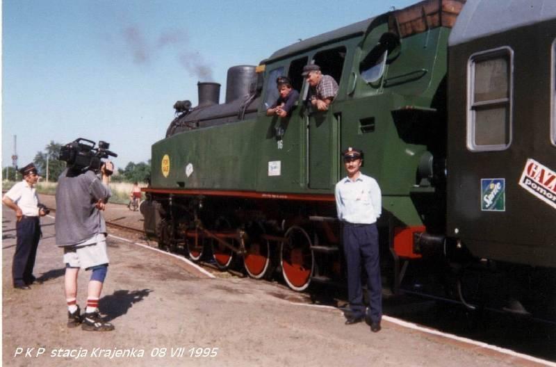 "Tur" w Krajence. Widok w kierunku Piły (południowy-zachód). Z lewej fragment budynku dworca. W tle nastawnia dysponująca.