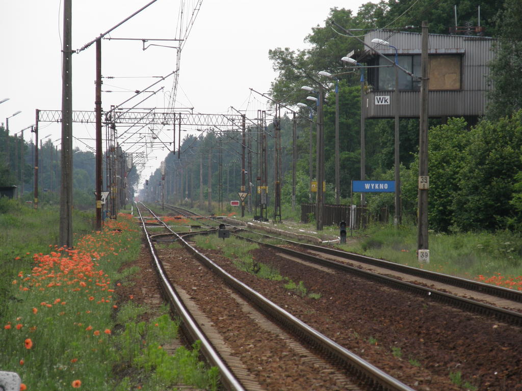 Semafory wjazdowe stacji Wykno. Widok w kierunku Tomaszowa Mazowieckiego. Widoczna nastawnia. 39,5 km.